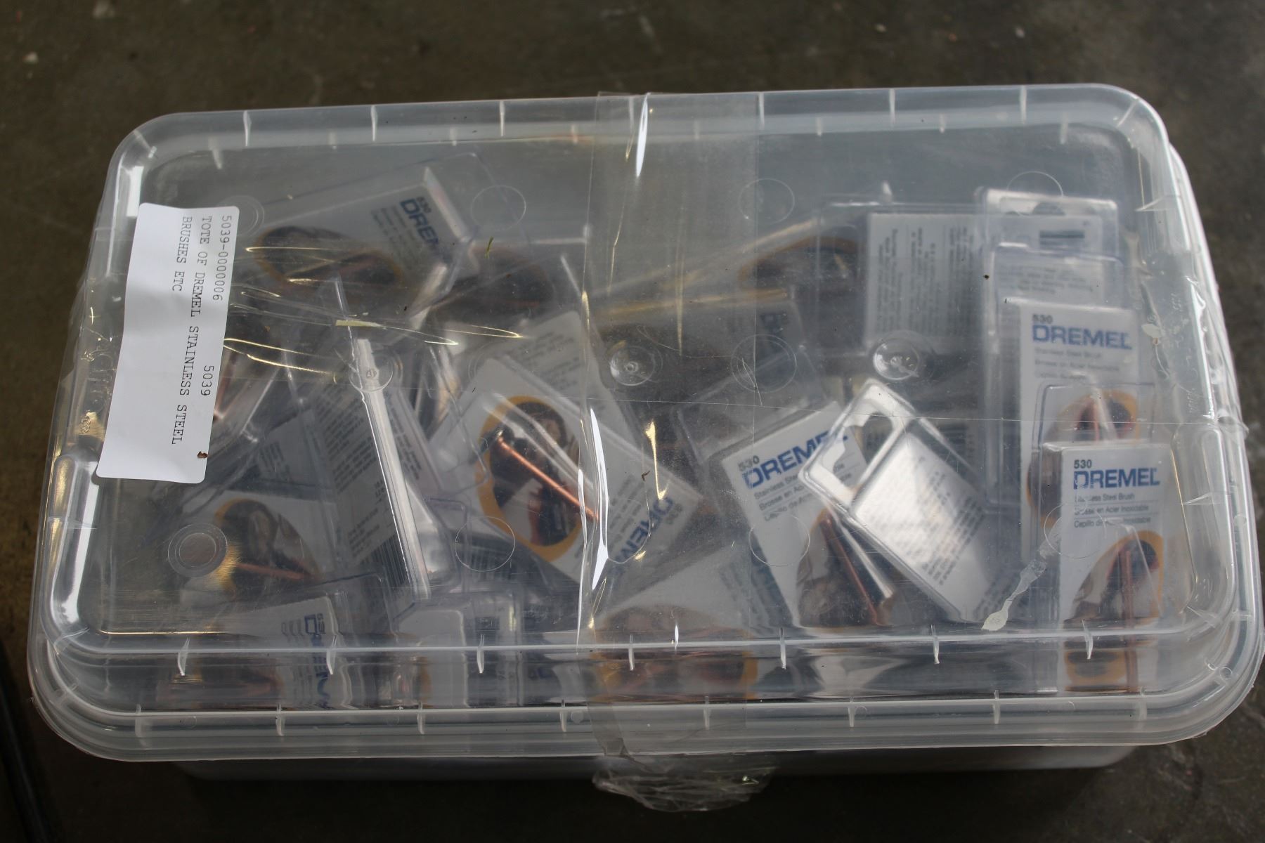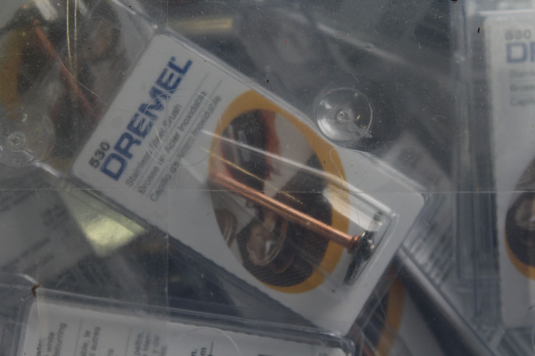 TOTE OF DREMEL STAINLESS STEEL BRUSHES ETC