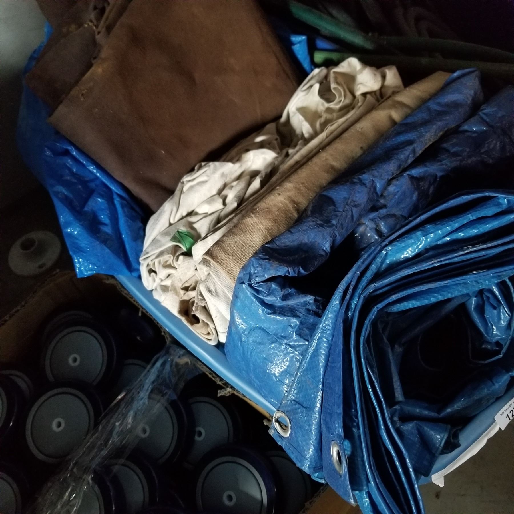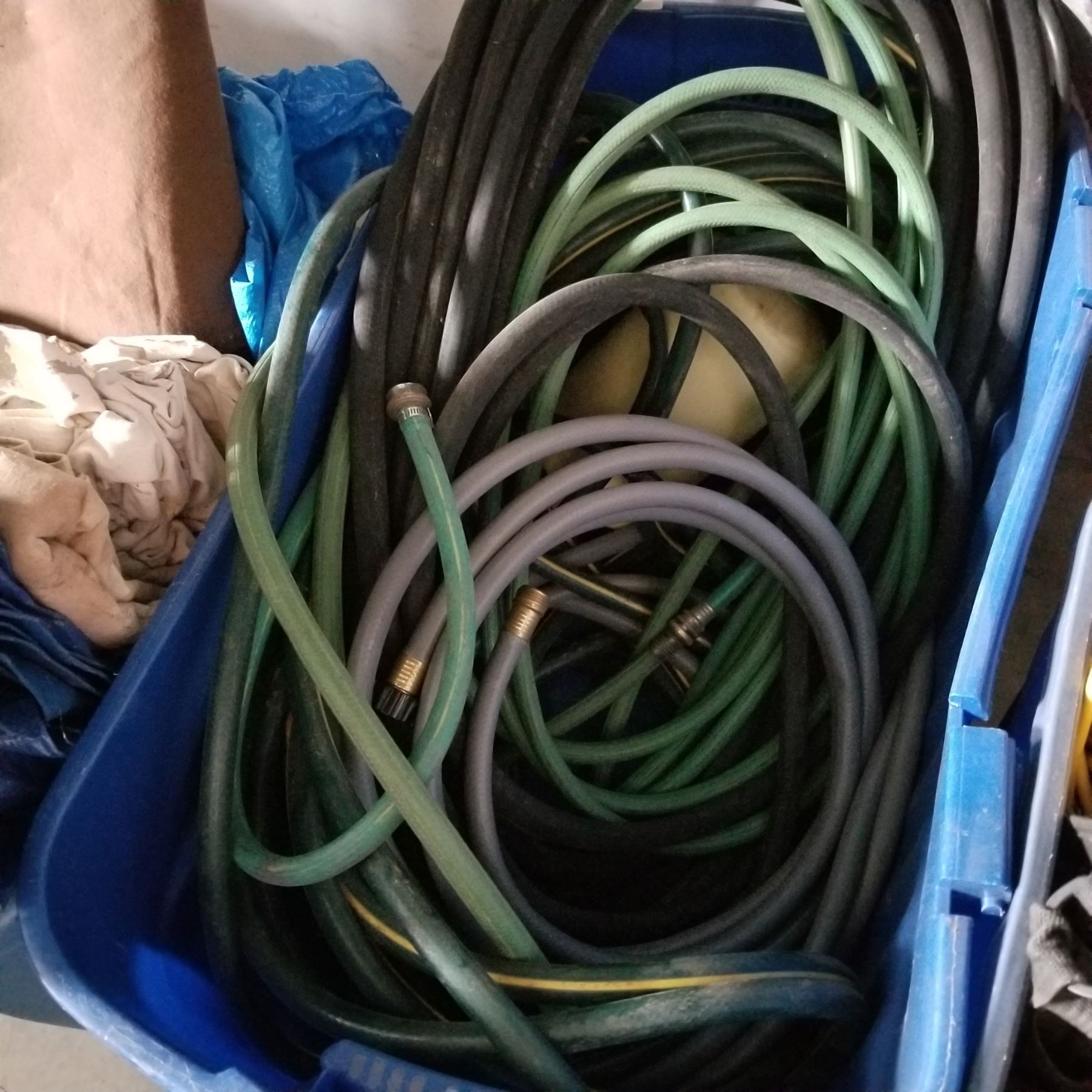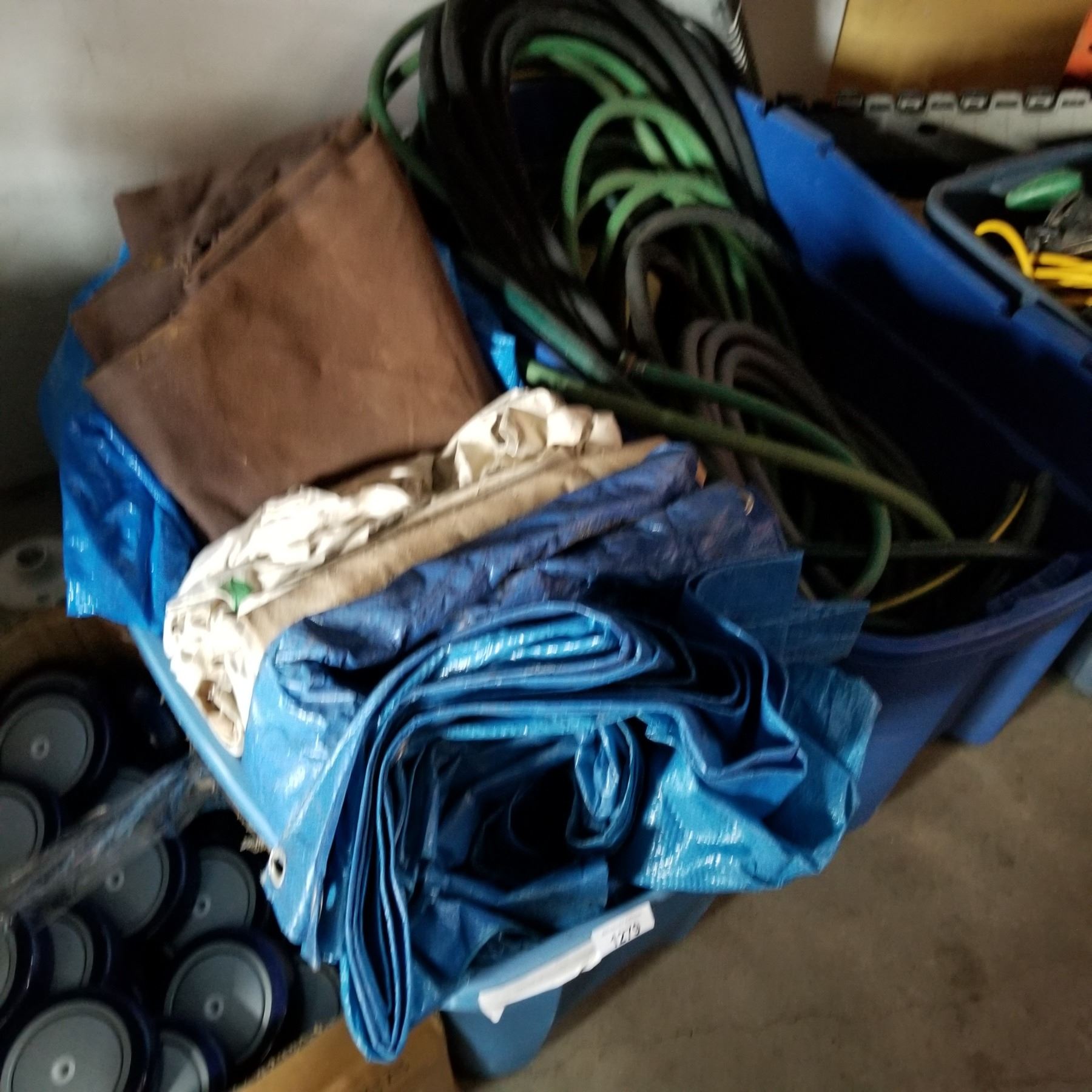 TOTE OF GARDEN HOSE, AND TOTE OF TARP AND DROP SHEETS