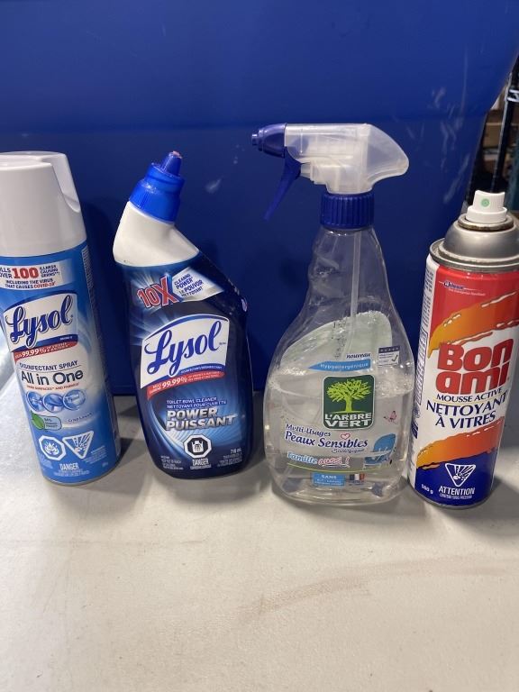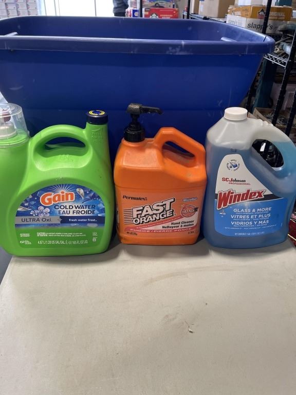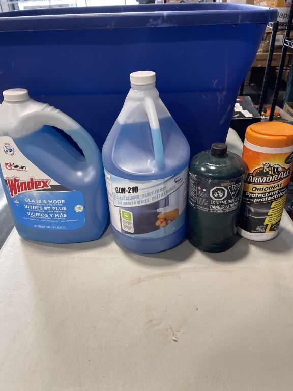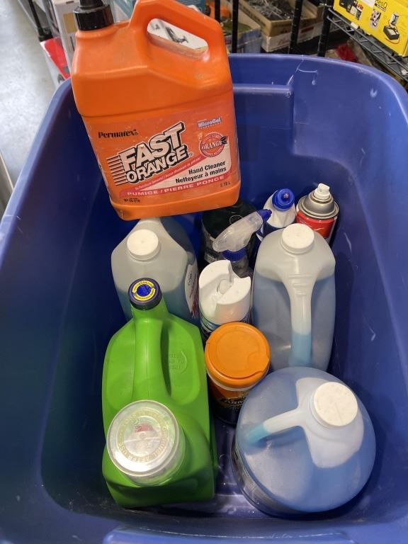 TOTE OF HOUSEHOLD CLEANING SUPPLIES