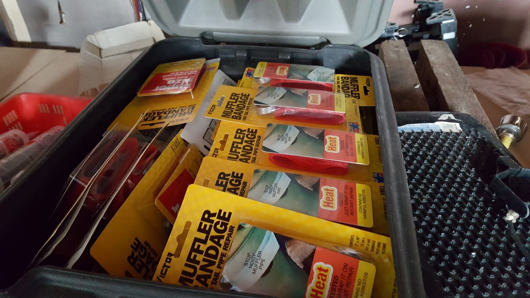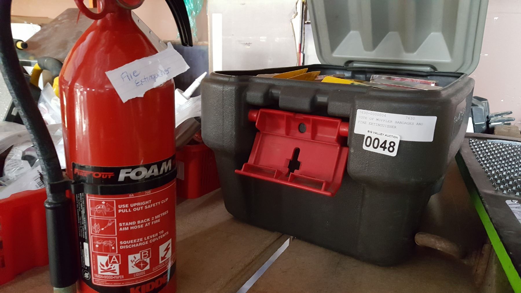 TOTE OF MUFFLER BANDAGES AND FIRE EXTINGUISHER