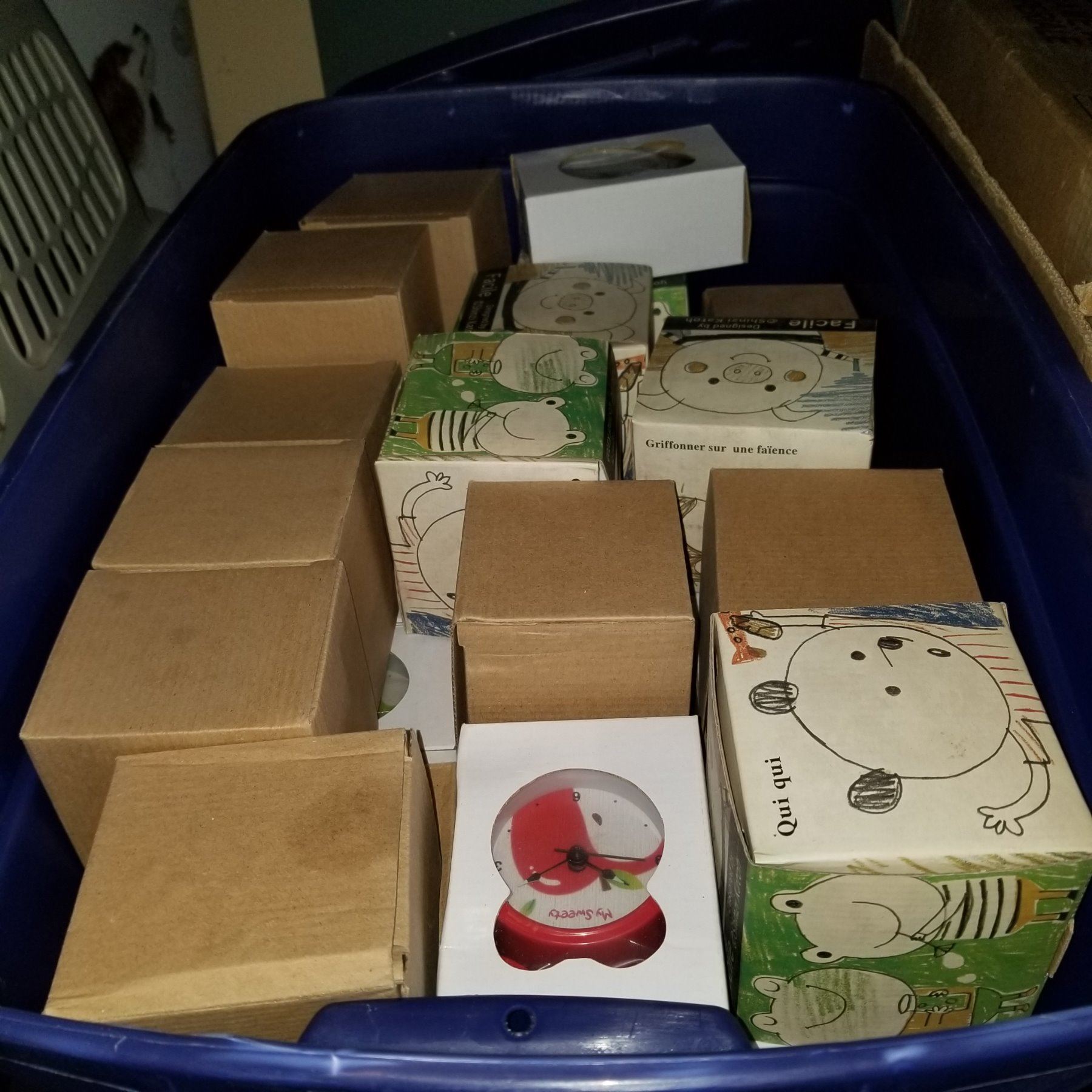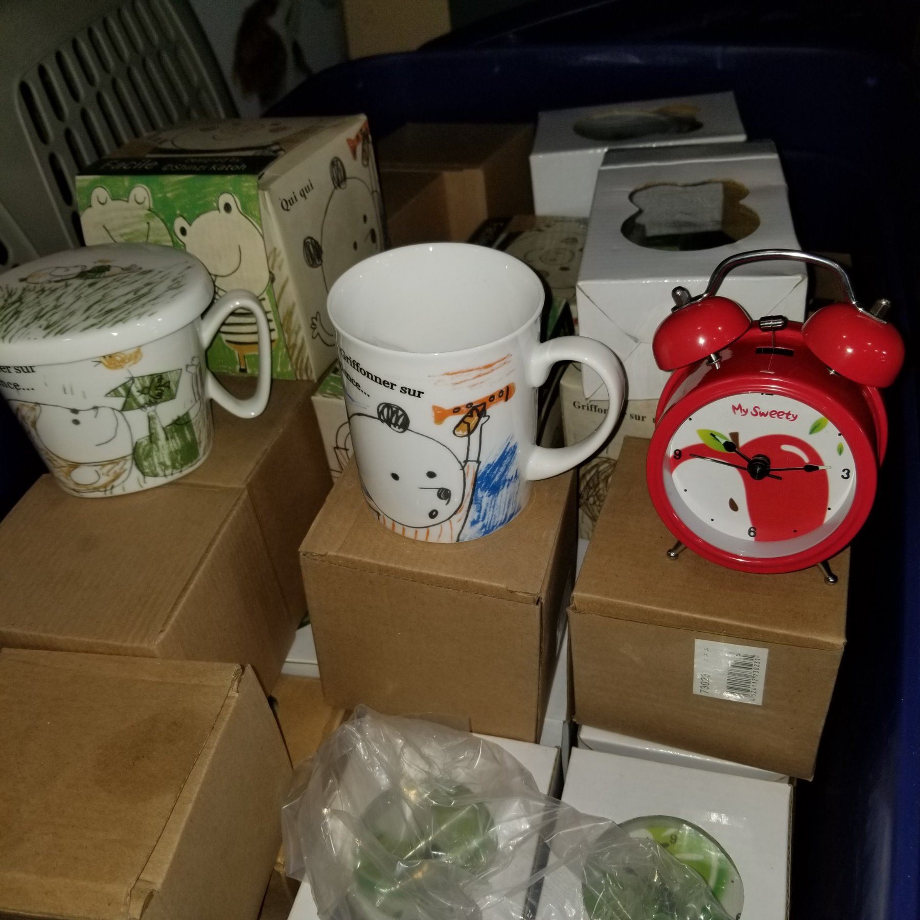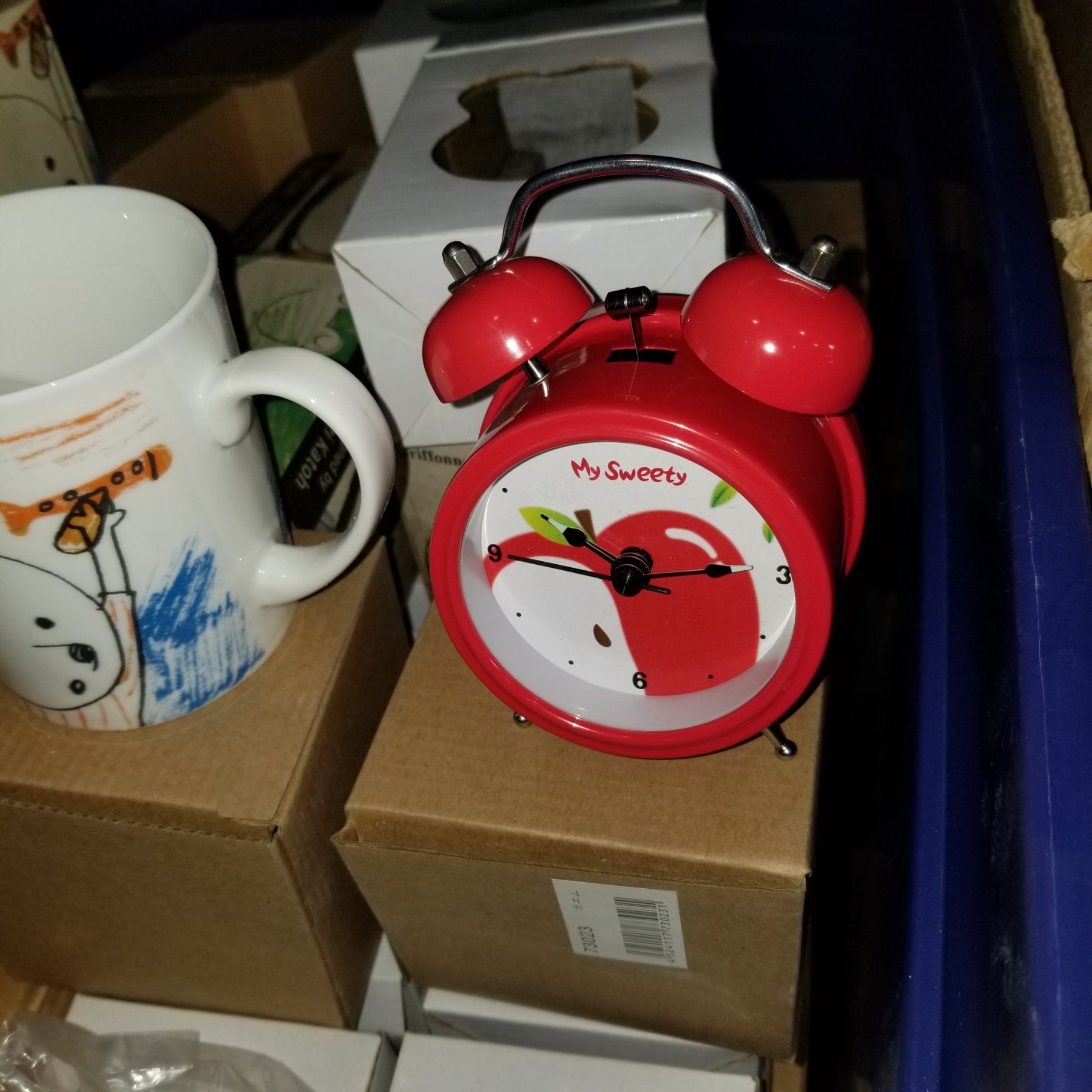 TOTE OF NEW ALARM CLOCKS AND PERCELAIN CONTAINERS