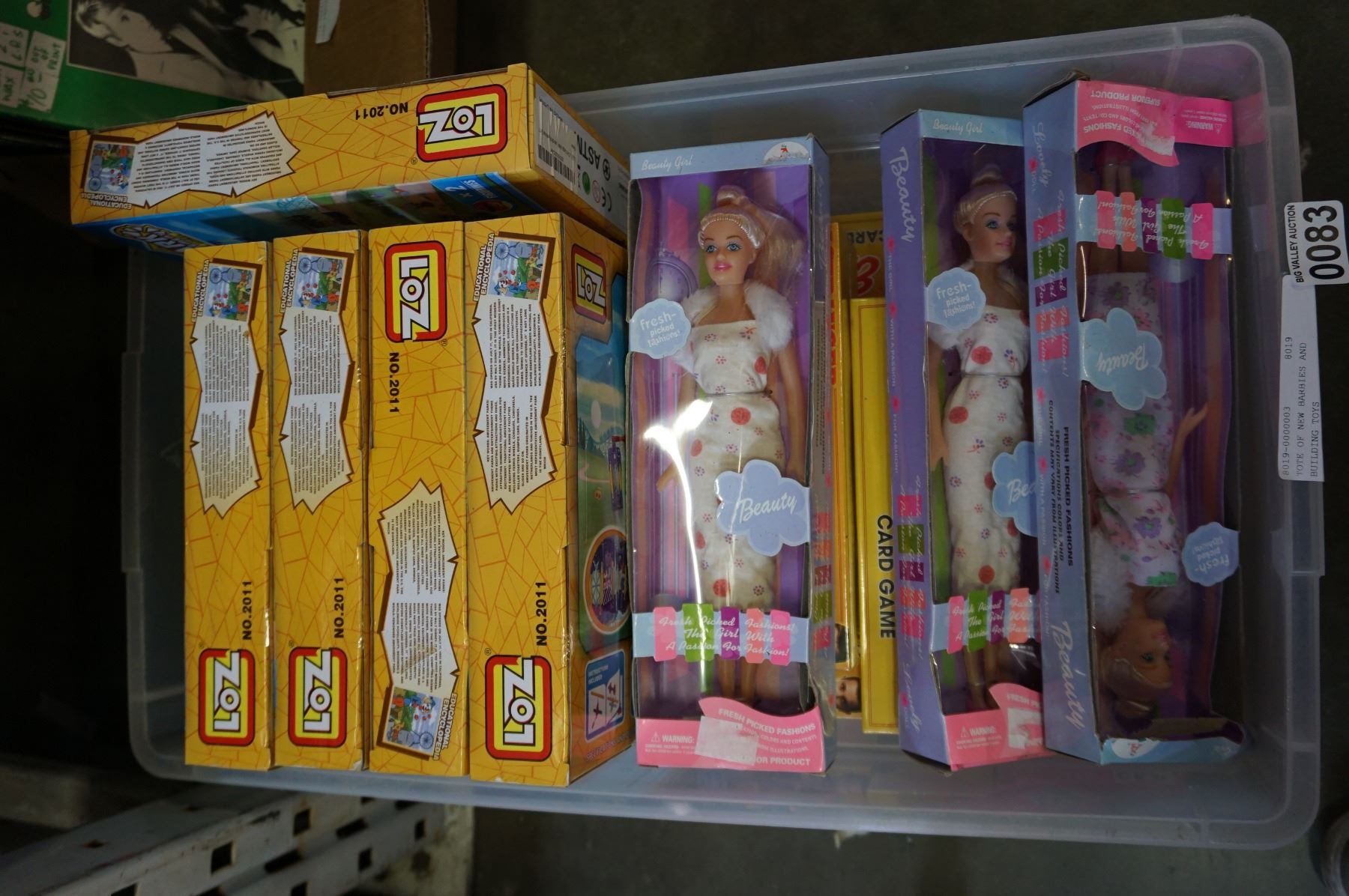 TOTE OF NEW BARBIES AND BUILDING TOYS