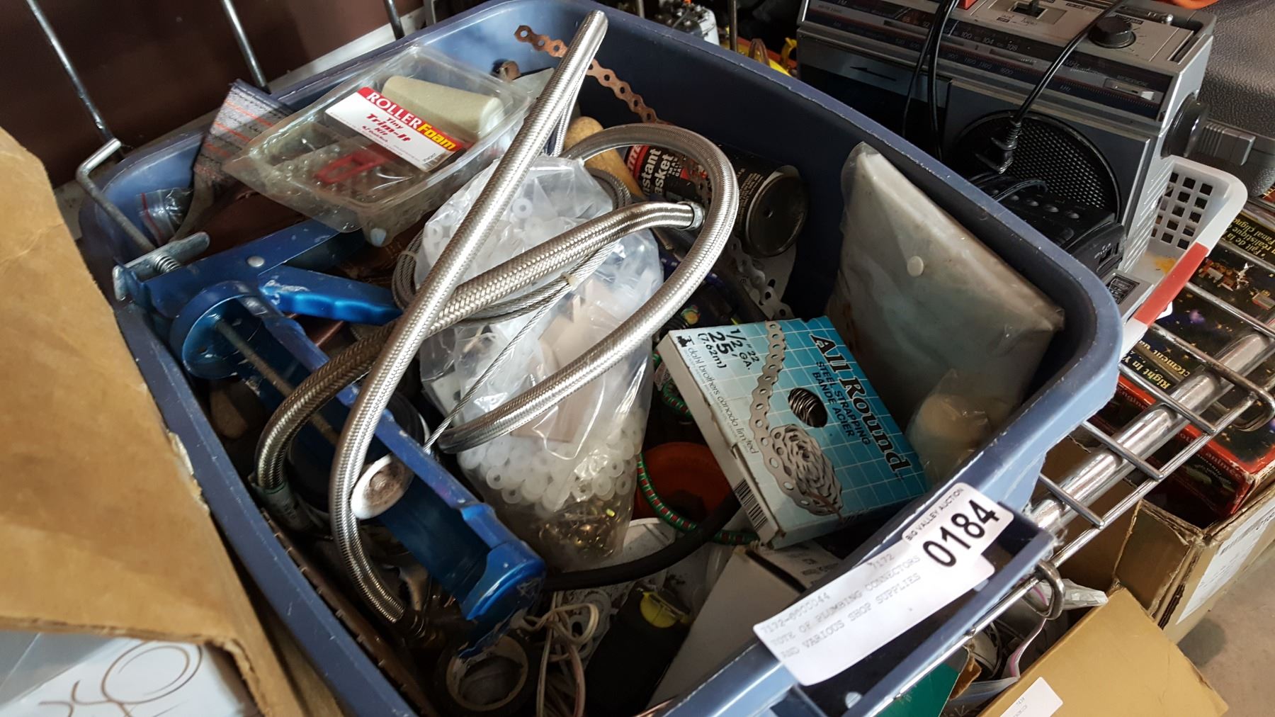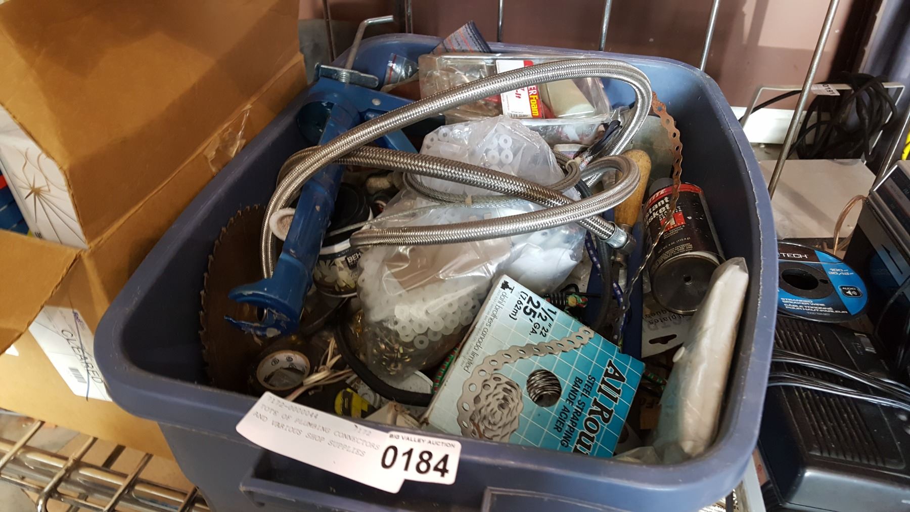 TOTE OF PLUMBING CONNECTORS AND VARIOUS SHOP SUPPLIES
