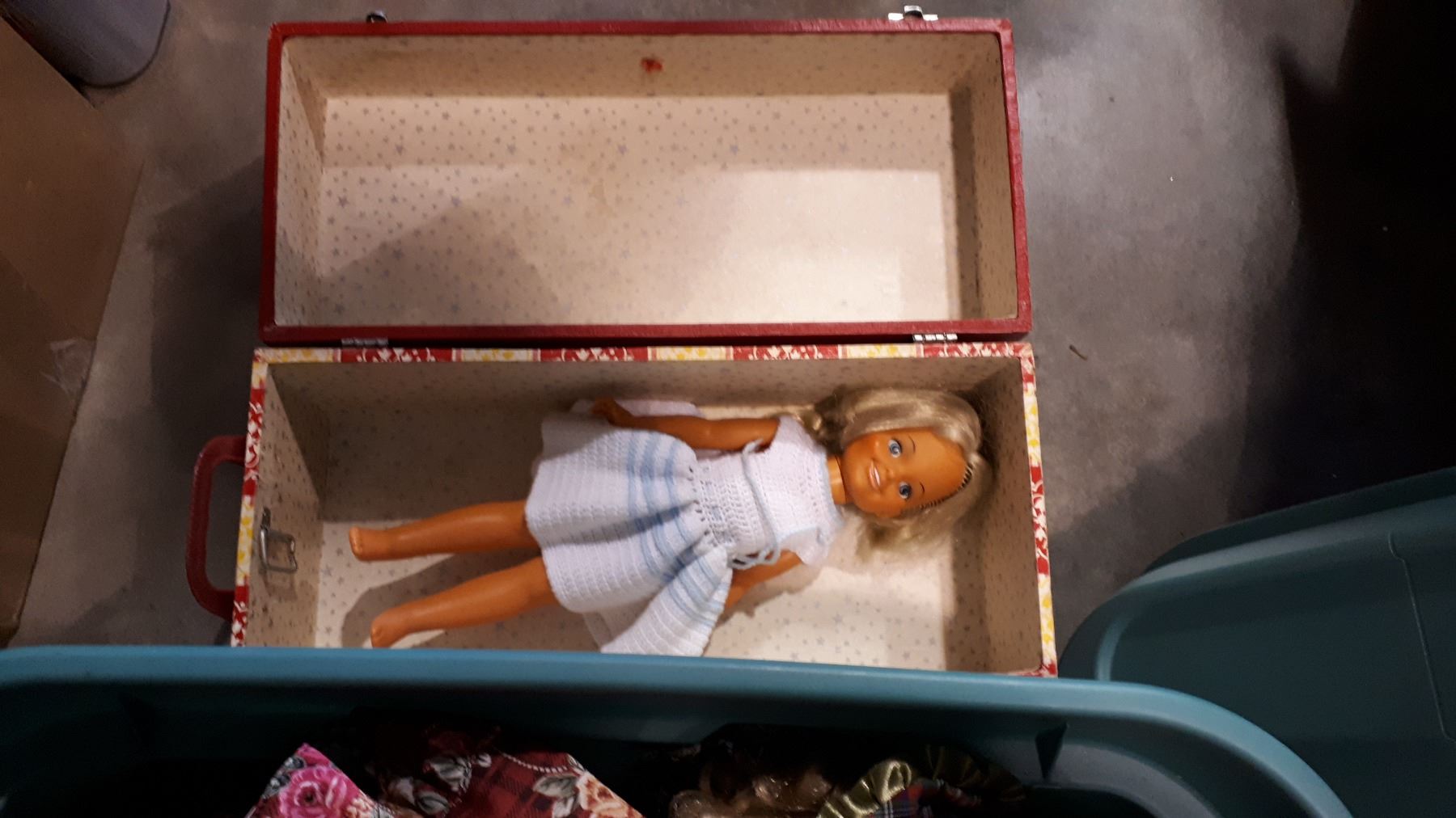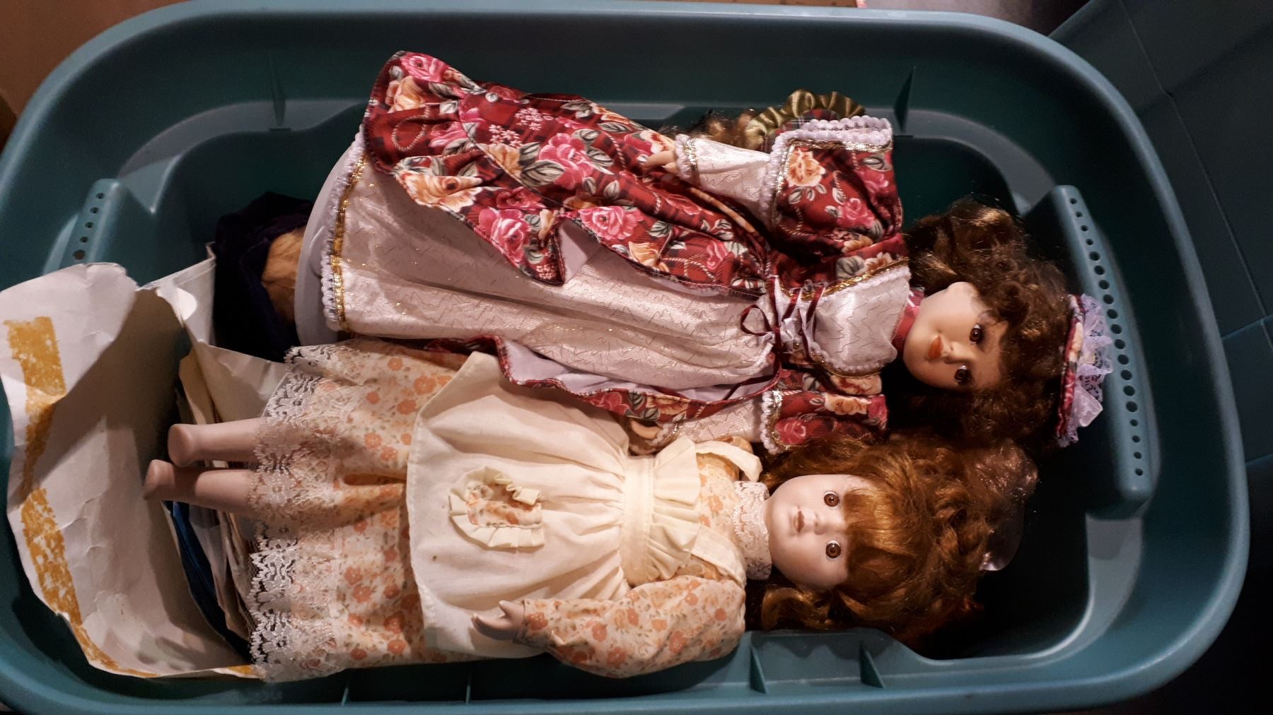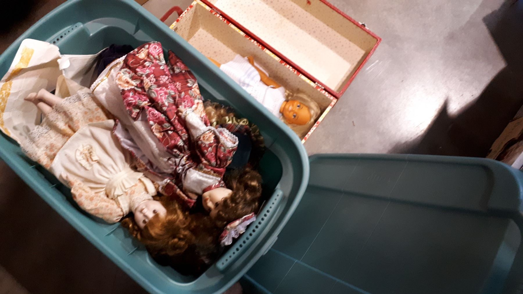 TOTE OF PORCELAIN DOLLS AND VINTAGE DOLL