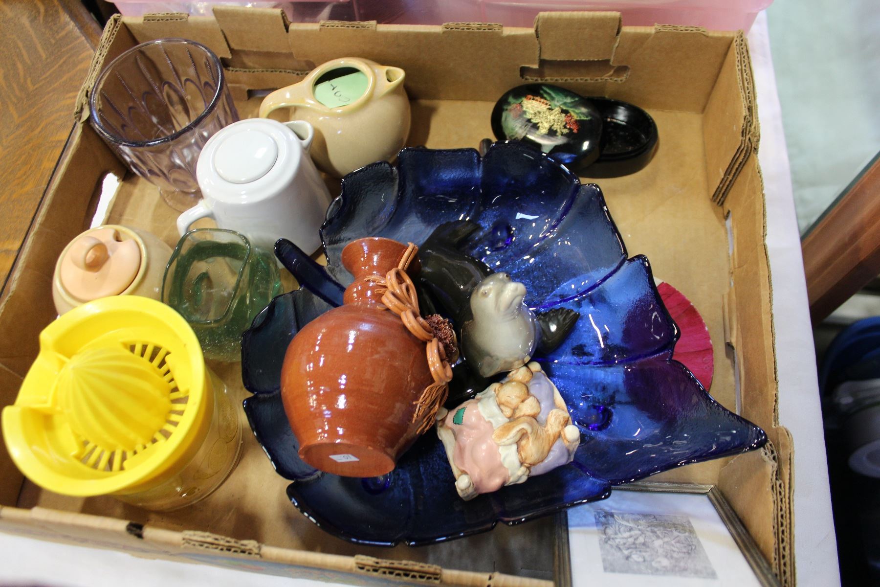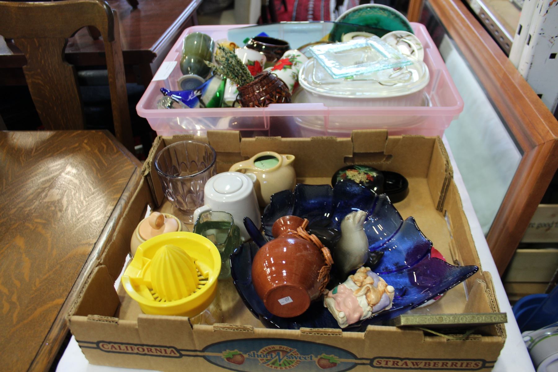 TOTE OF POTTERY, ART GLASS, AND GLASSWARE