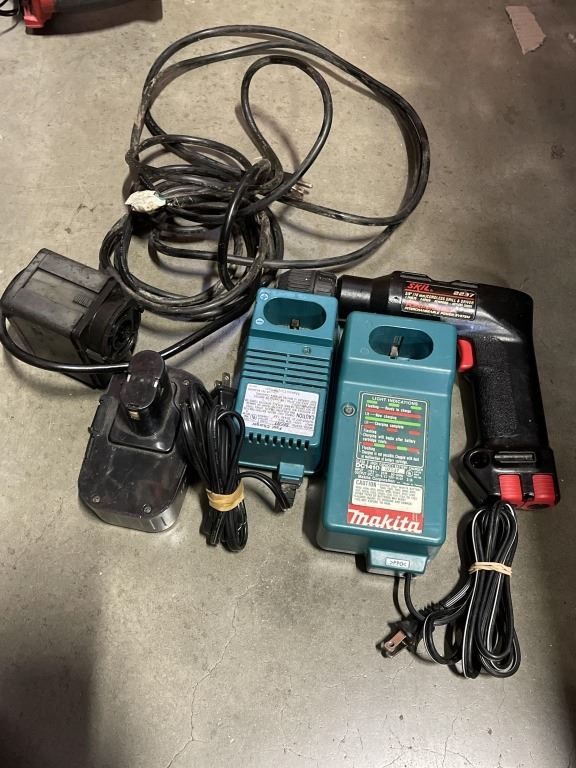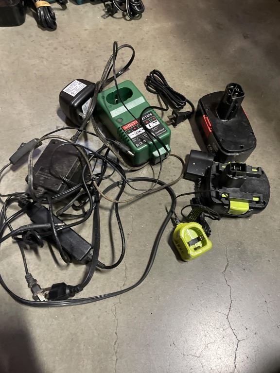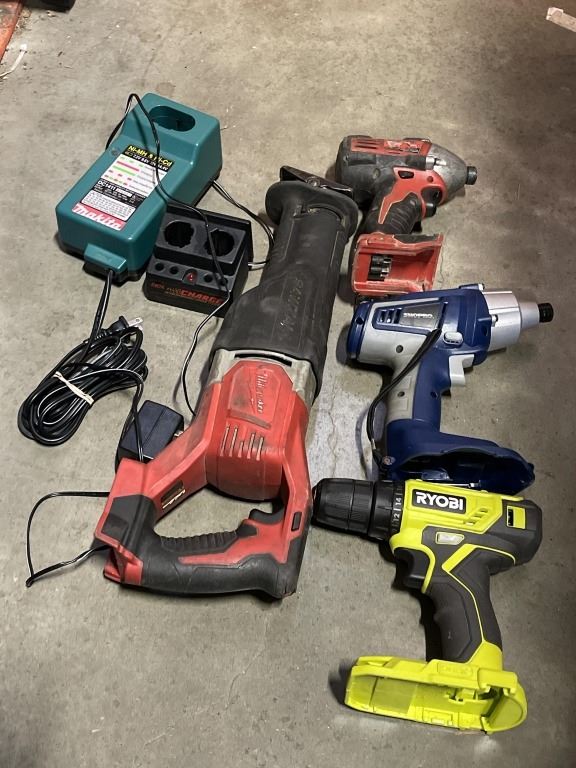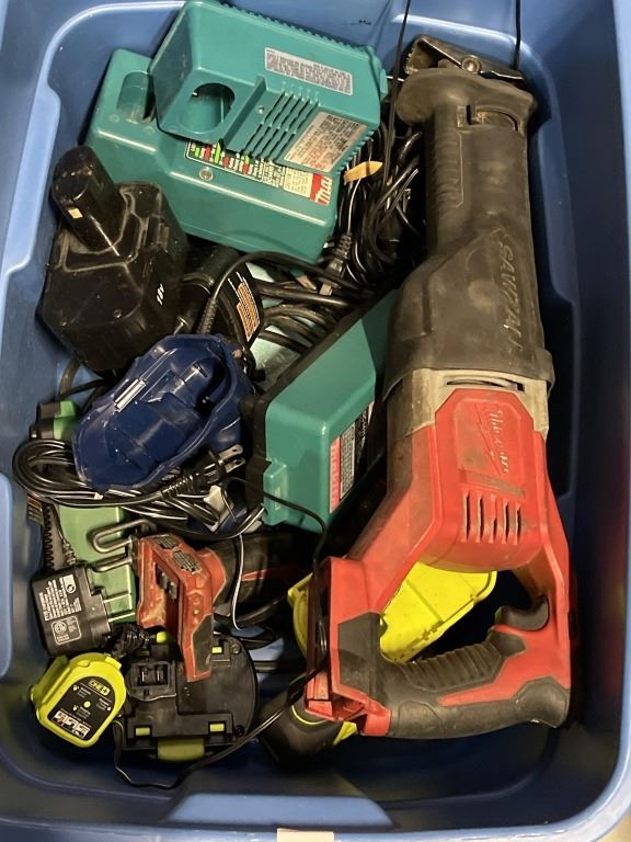 TOTE OF POWER TOOL WITH BATTERIES AND BATTERY CHARGERS