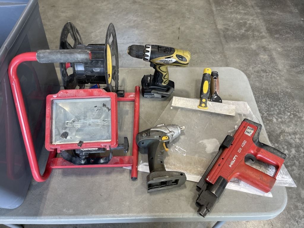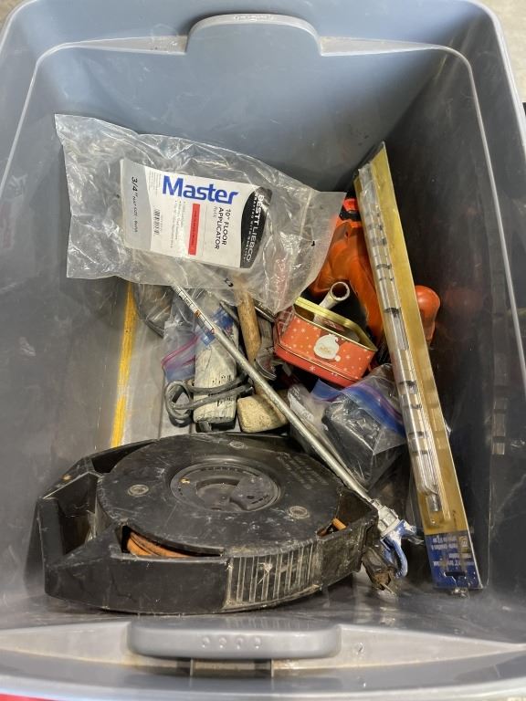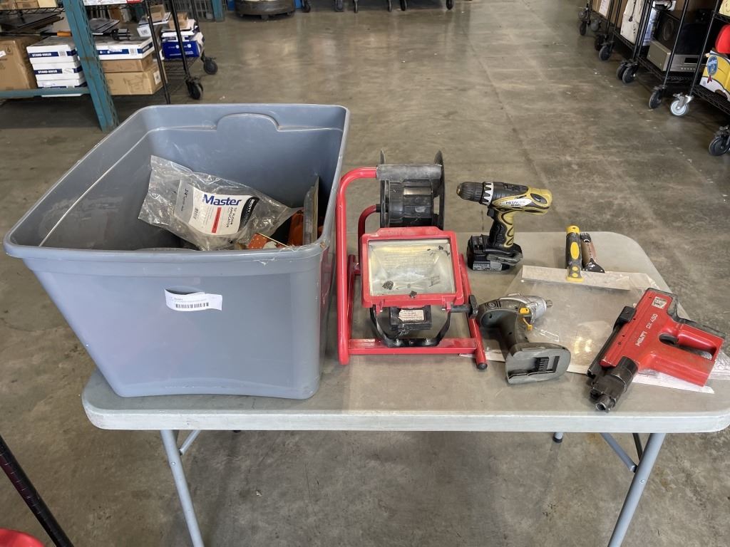 TOTE OF POWER TOOLS AND SHOP SUPPLIES,