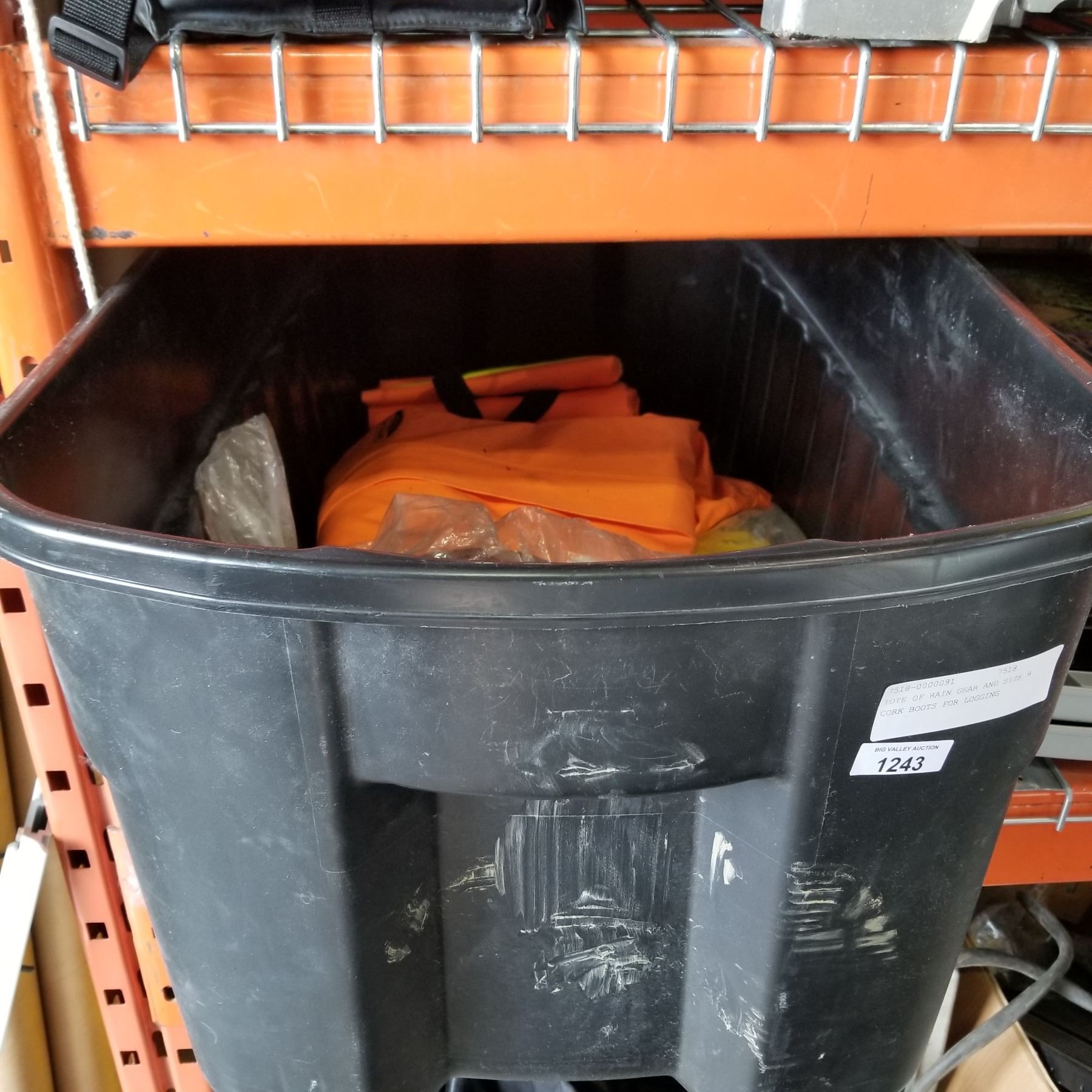 TOTE OF RAIN GEAR AND SIZE 9 CORK BOOTS FOR LOGGING