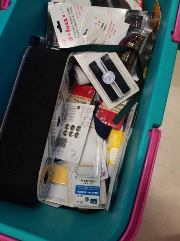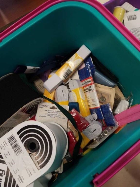 TOTE OF SEWING NOTIONS, ELASTIC, THREAD, PATCHES, ETC