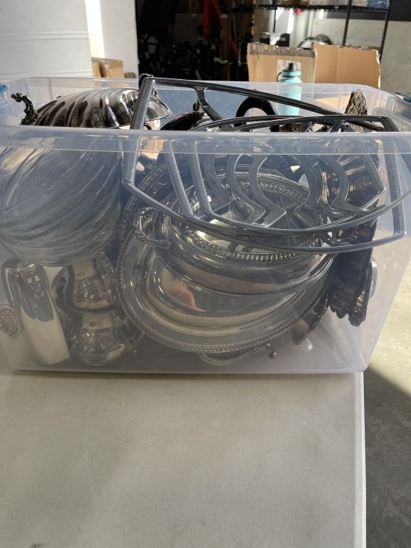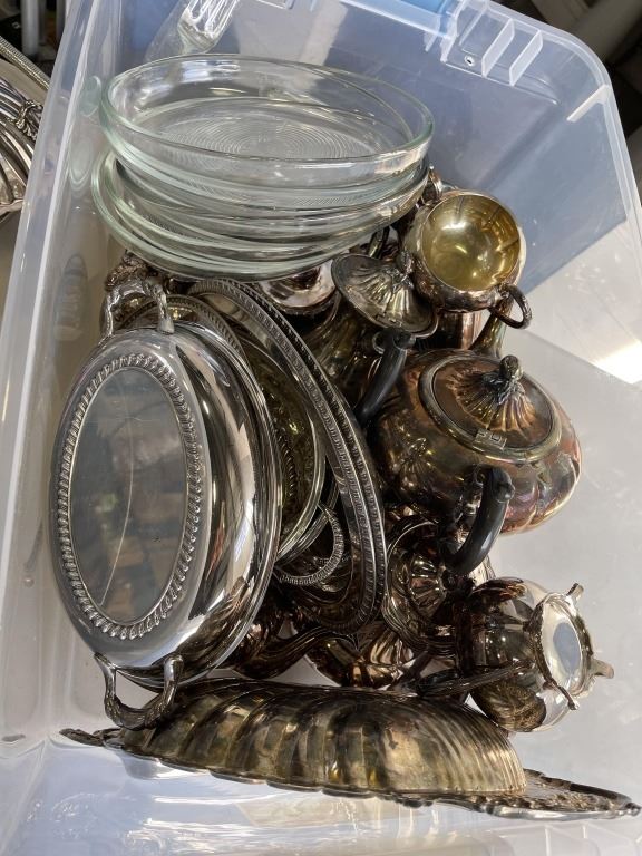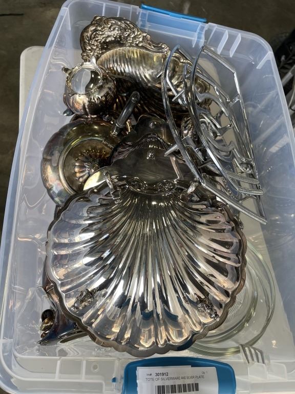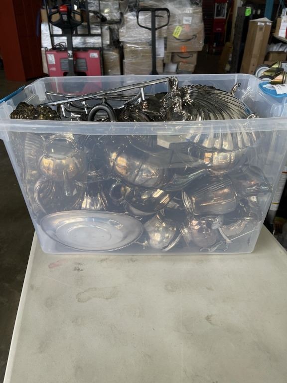 TOTE OF SILVERWARE AND SILVER PLATE SERVING ITEMS
