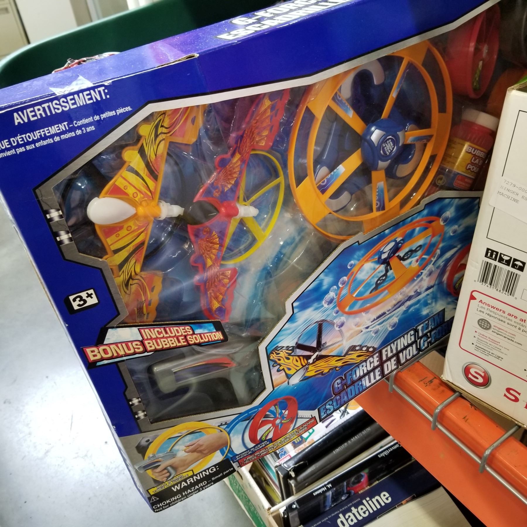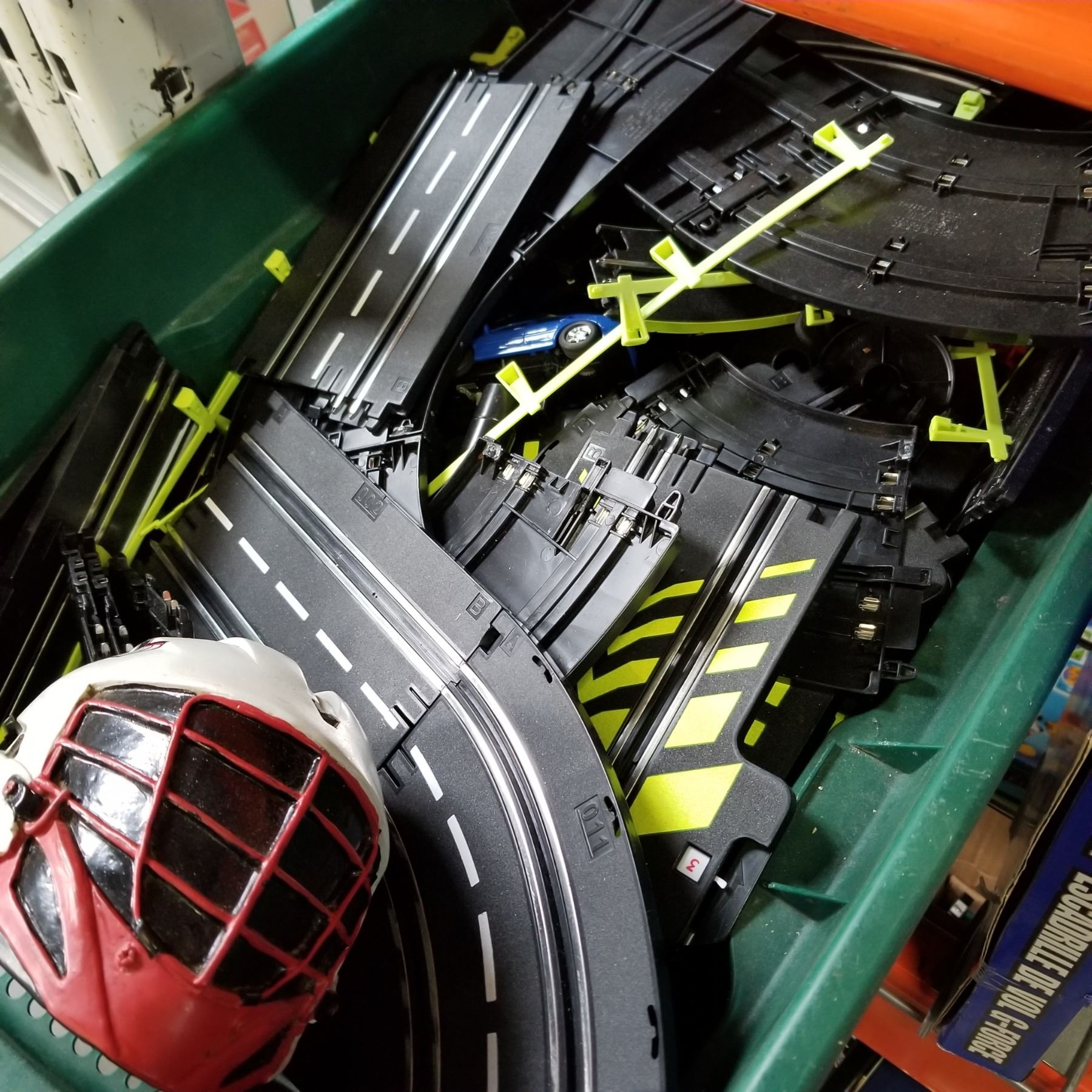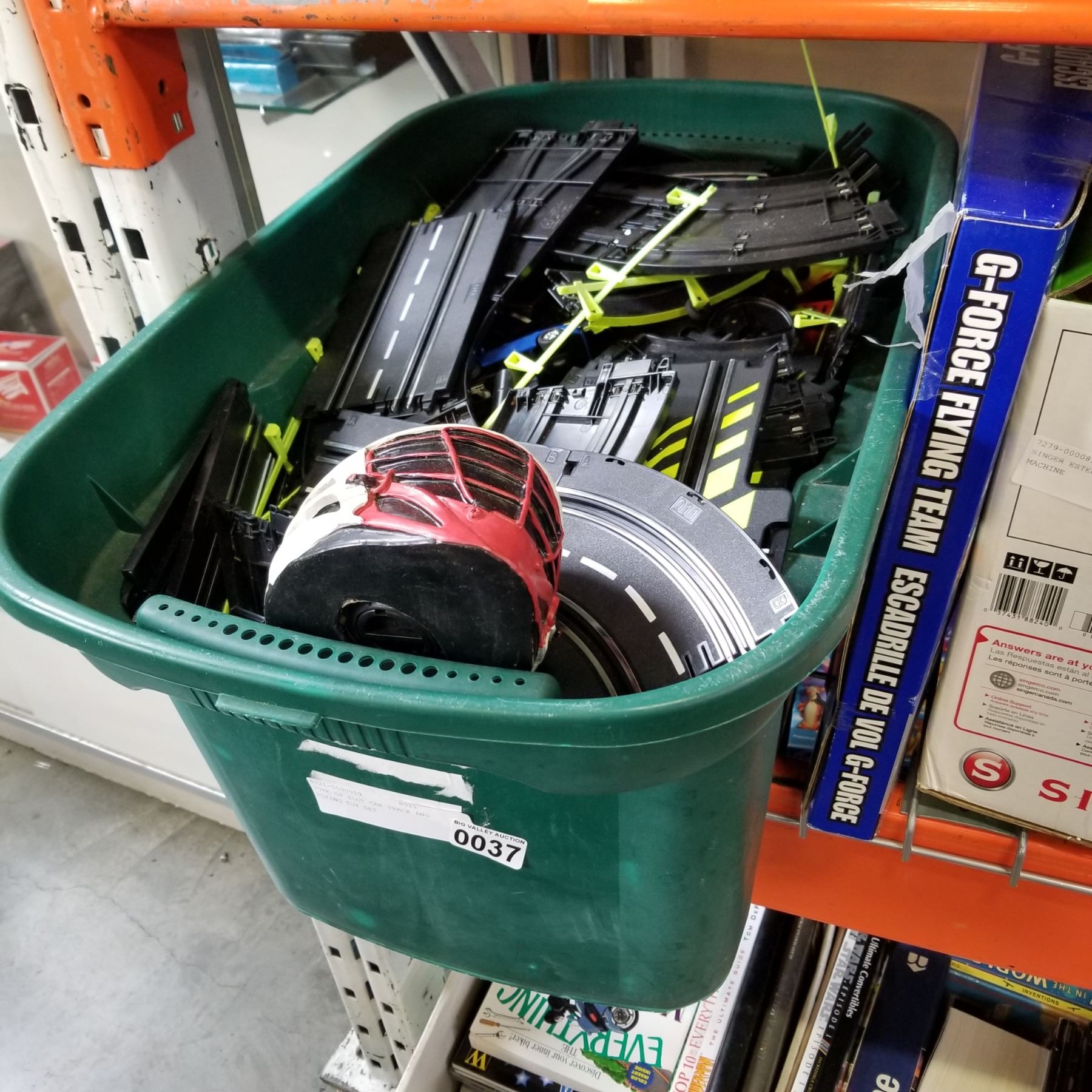 TOTE OF SLOT CAR TRACK AND FLYING TOY SET