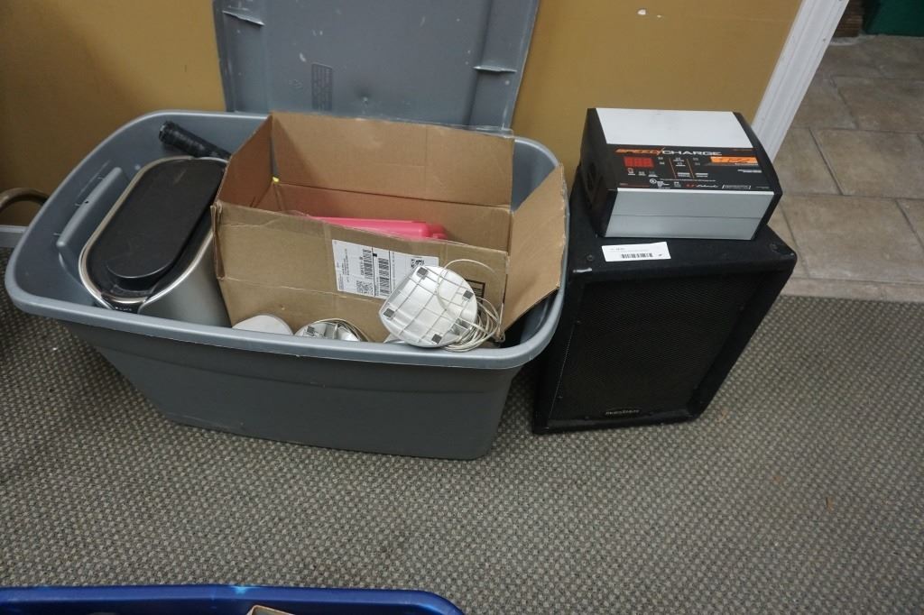 TOTE OF SONY AND RADIOSHACK SPEAKERS WITH SPEED CHARGE 12 BATTERY CHARGER