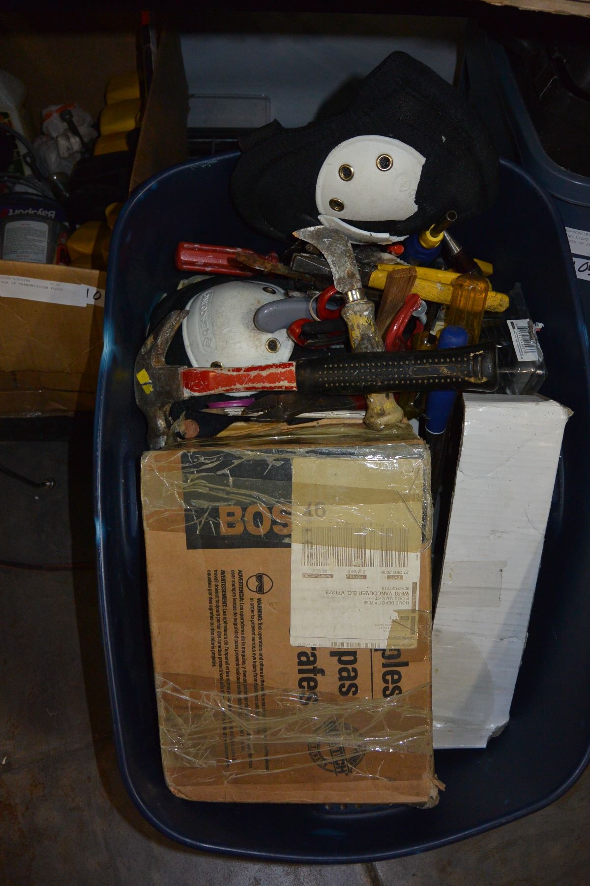 TOTE OF STAPLES TOOLS AND SHOP SUPPLIES
