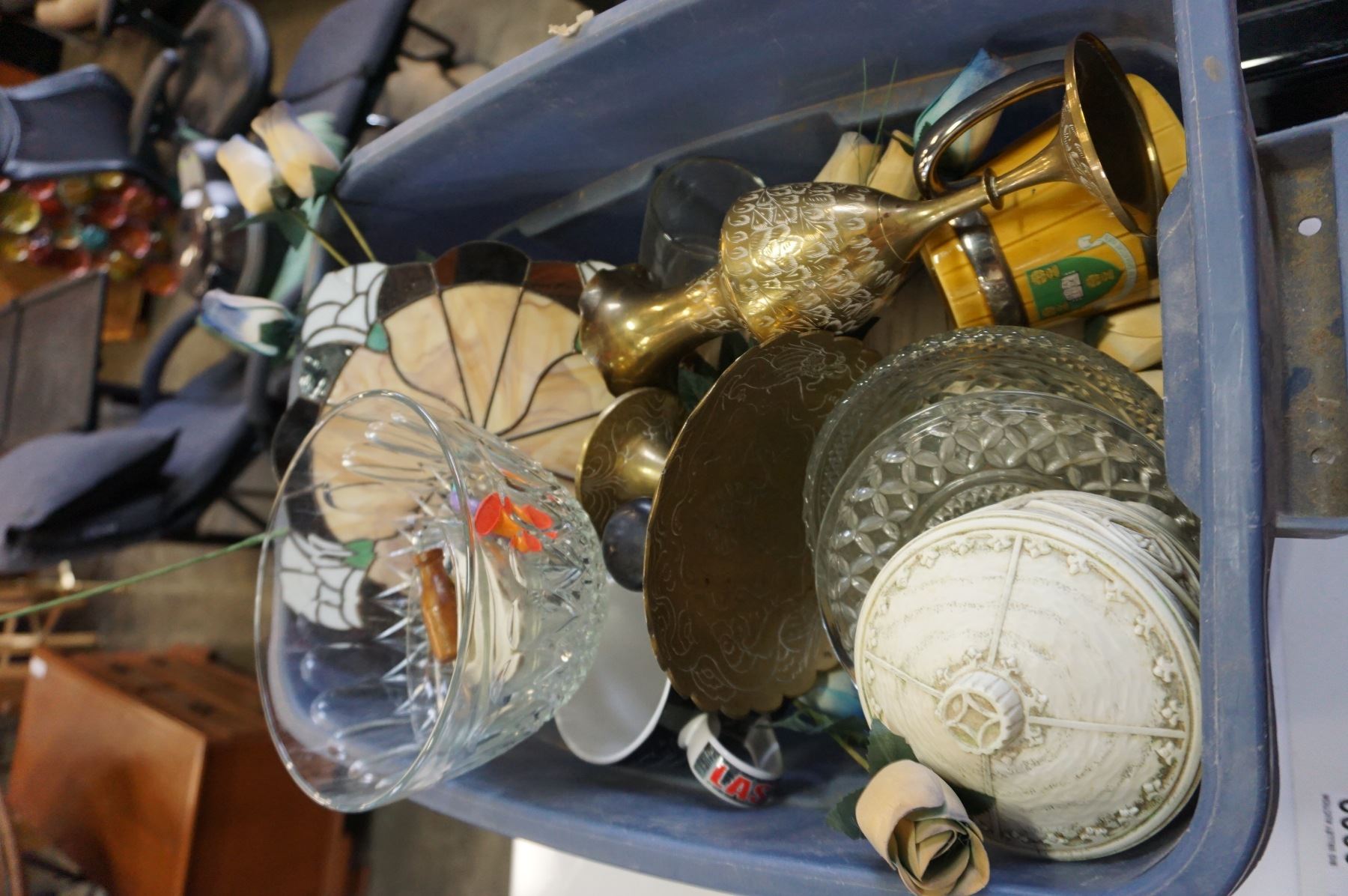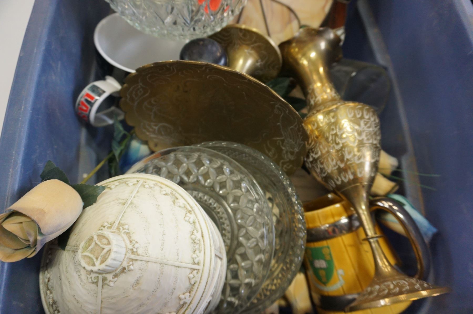 TOTE OF STEINS, BRASS PEDSTAL BOWL AND VASE, AND LEADED GLASS CLOCK