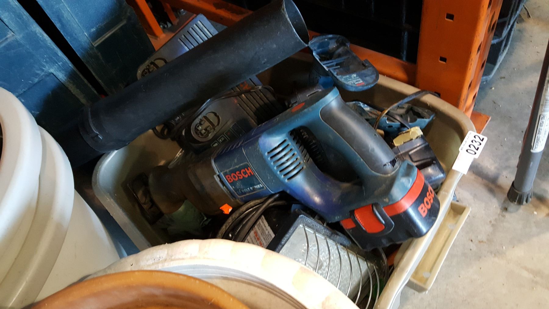 TOTE OF TOOLS AND BOSCH BATTERY CHARGER