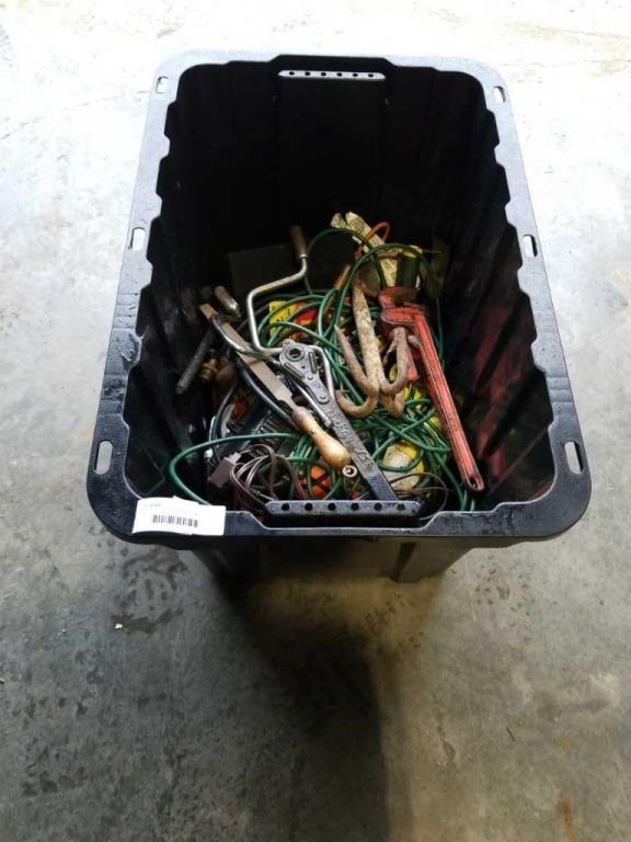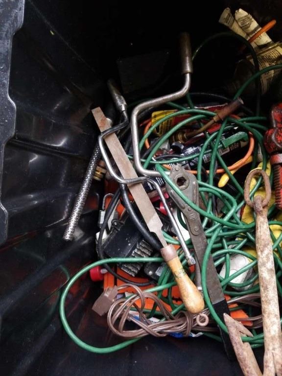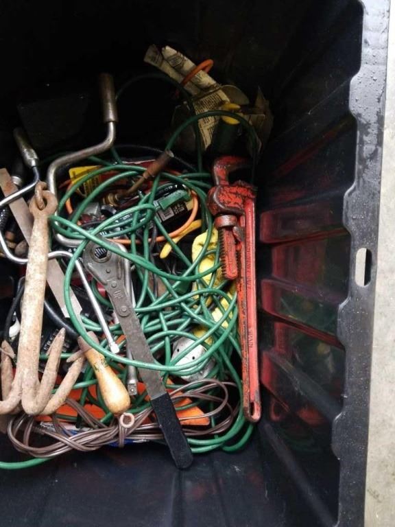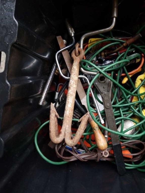 TOTE OF TOOLS, EXTENTION CORD, GRAPPLING HOOK, SHOP SUPPLIES