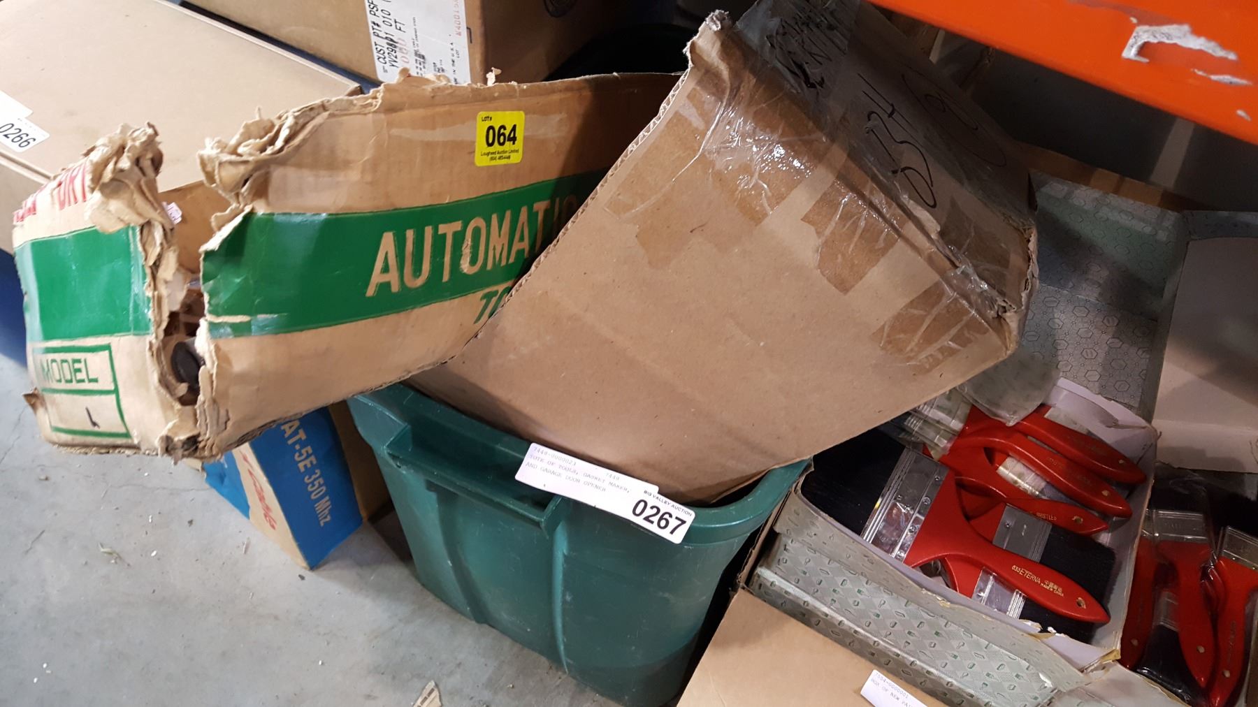 TOTE OF TOOLS, GASKET MAKER, AND GARAGE DOOR OPENER