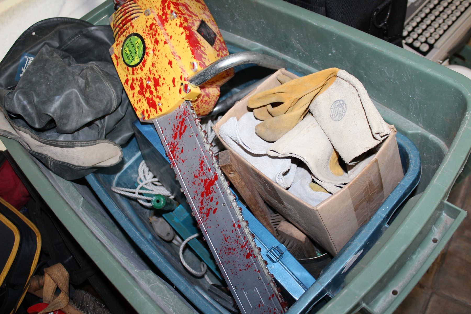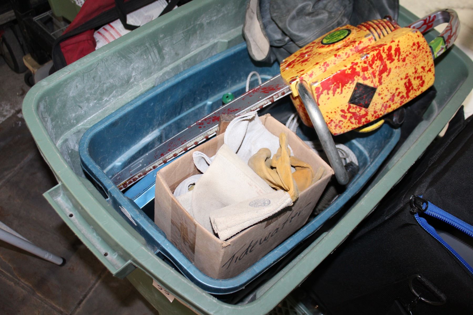 TOTE OF TOOLS SOCKET SET AND TOY CHAINSAW
