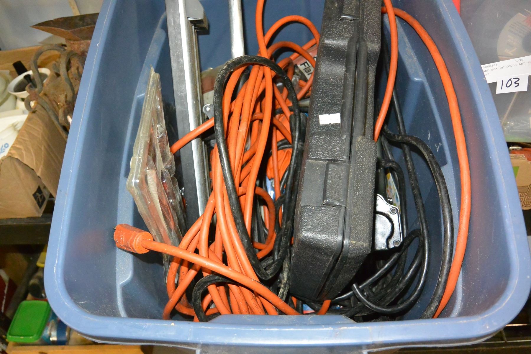 TOTE OF TOOLS TILE CUTTER AND AND EXTENSION CORDS