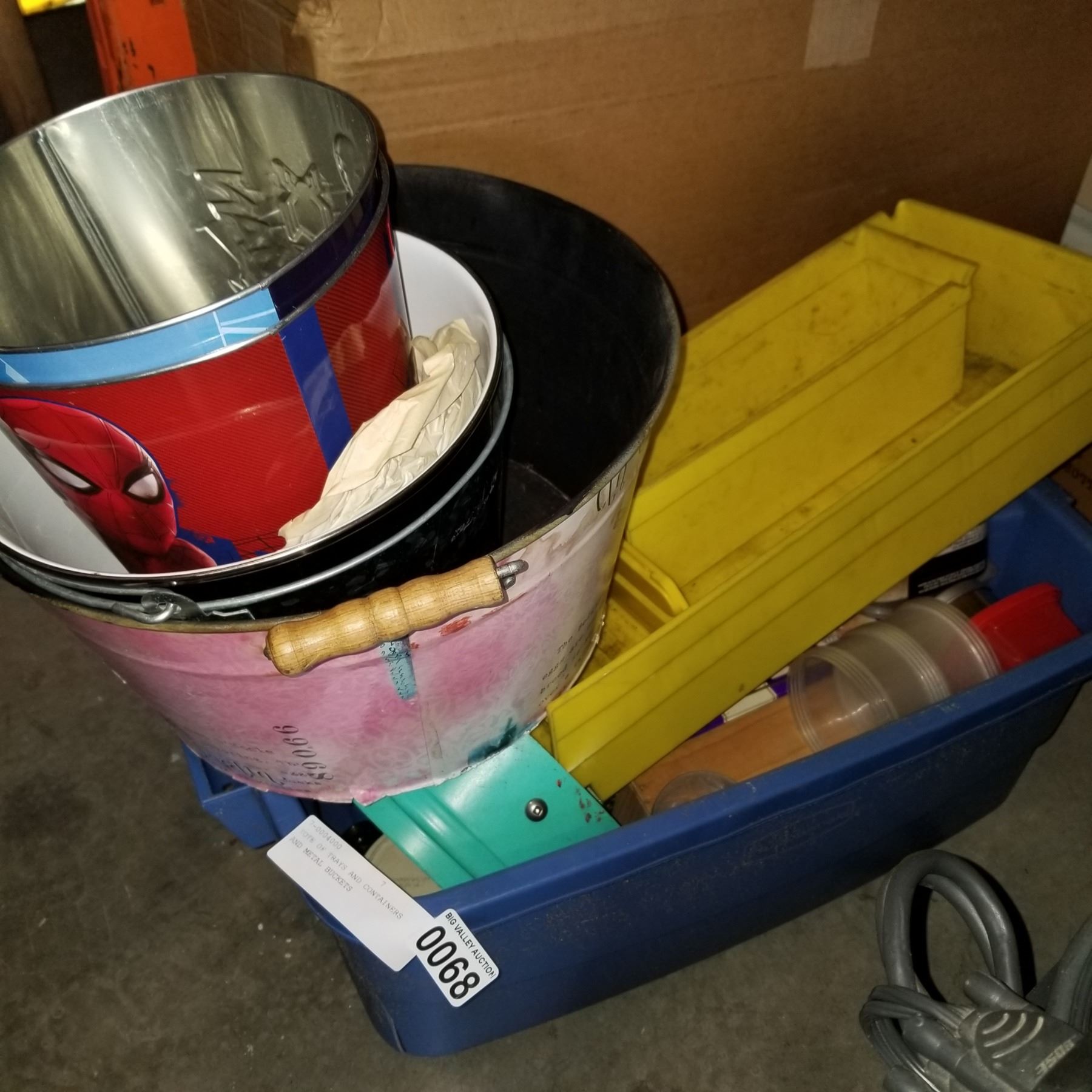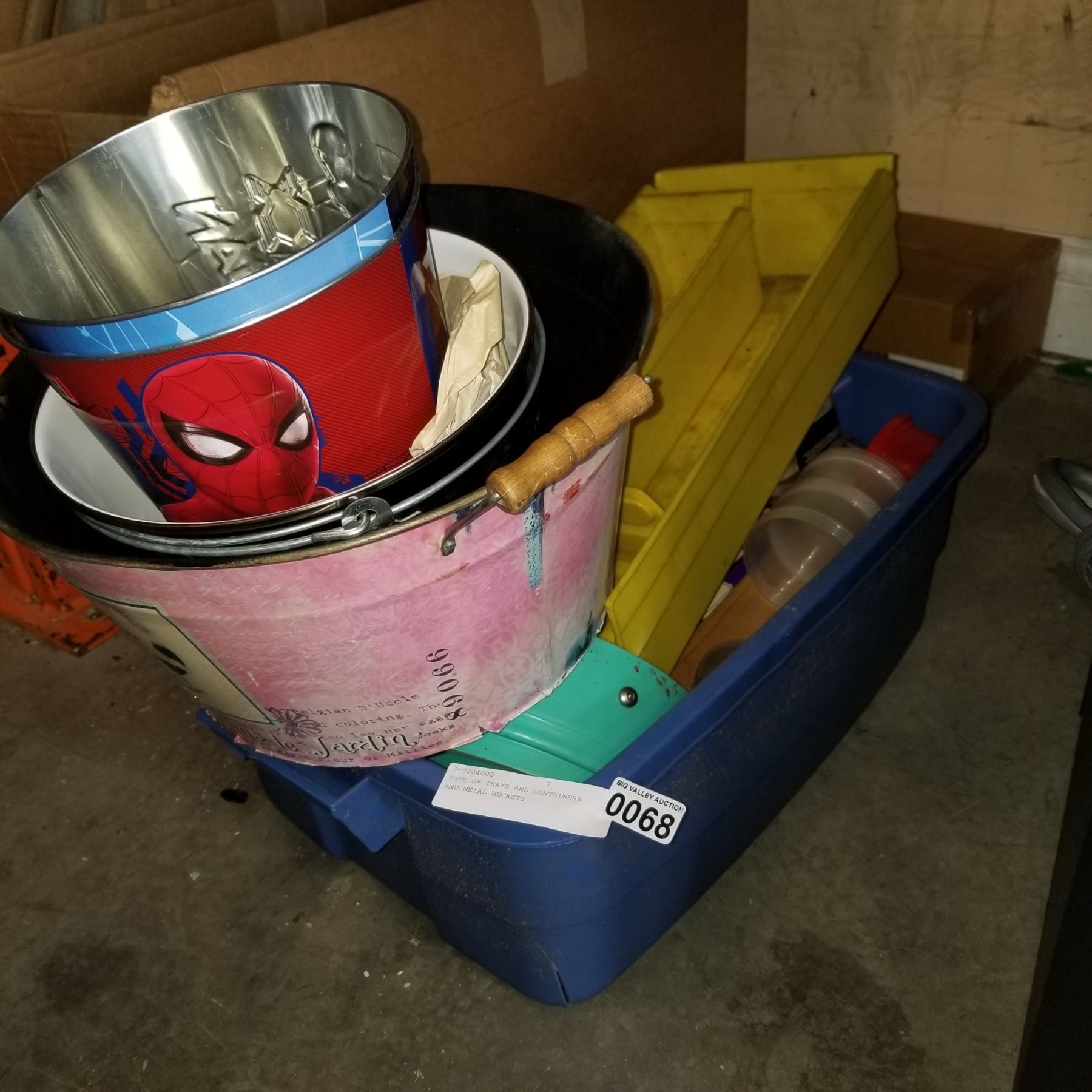 TOTE OF TRAYS AND CONTAINERS AND METAL BUCKETS