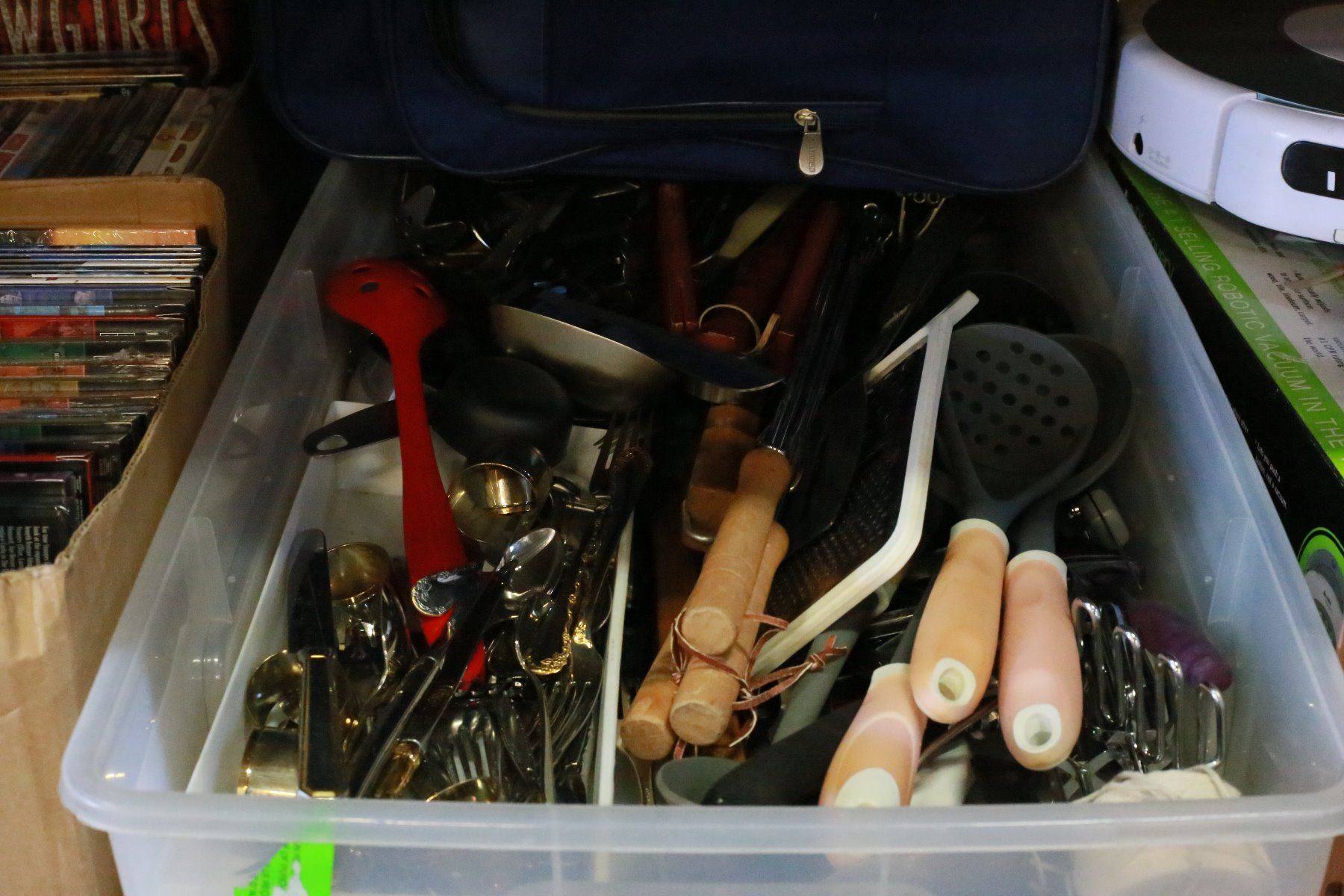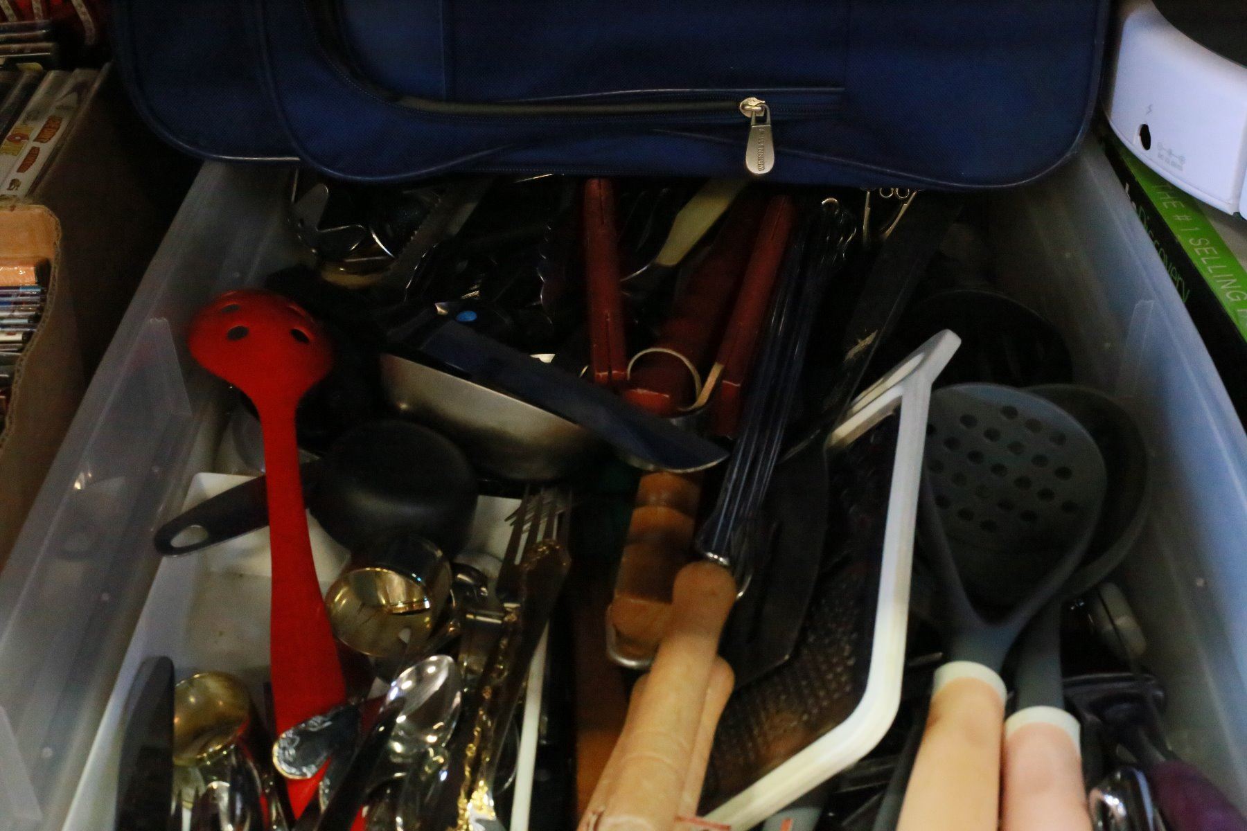 TOTE OF UTENSILS SUITCASE AND BLANKET