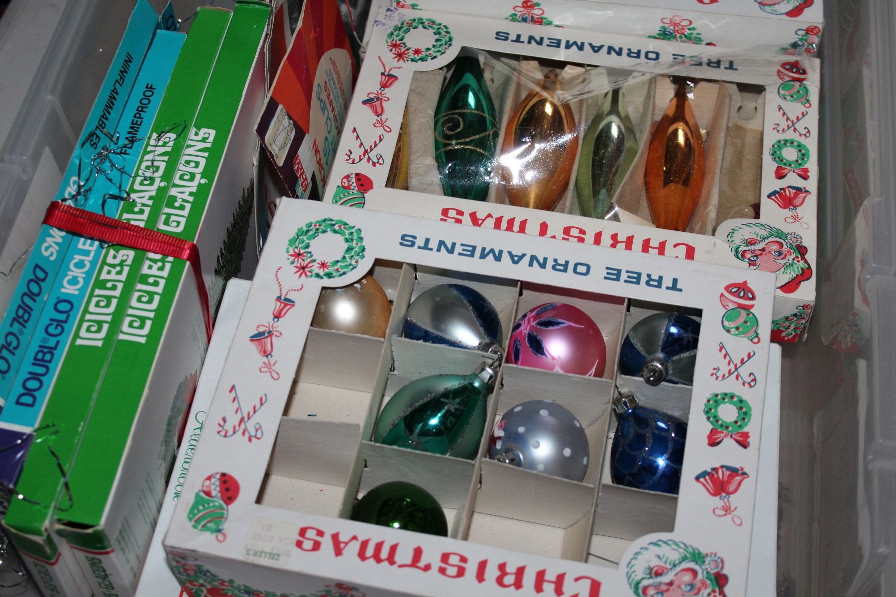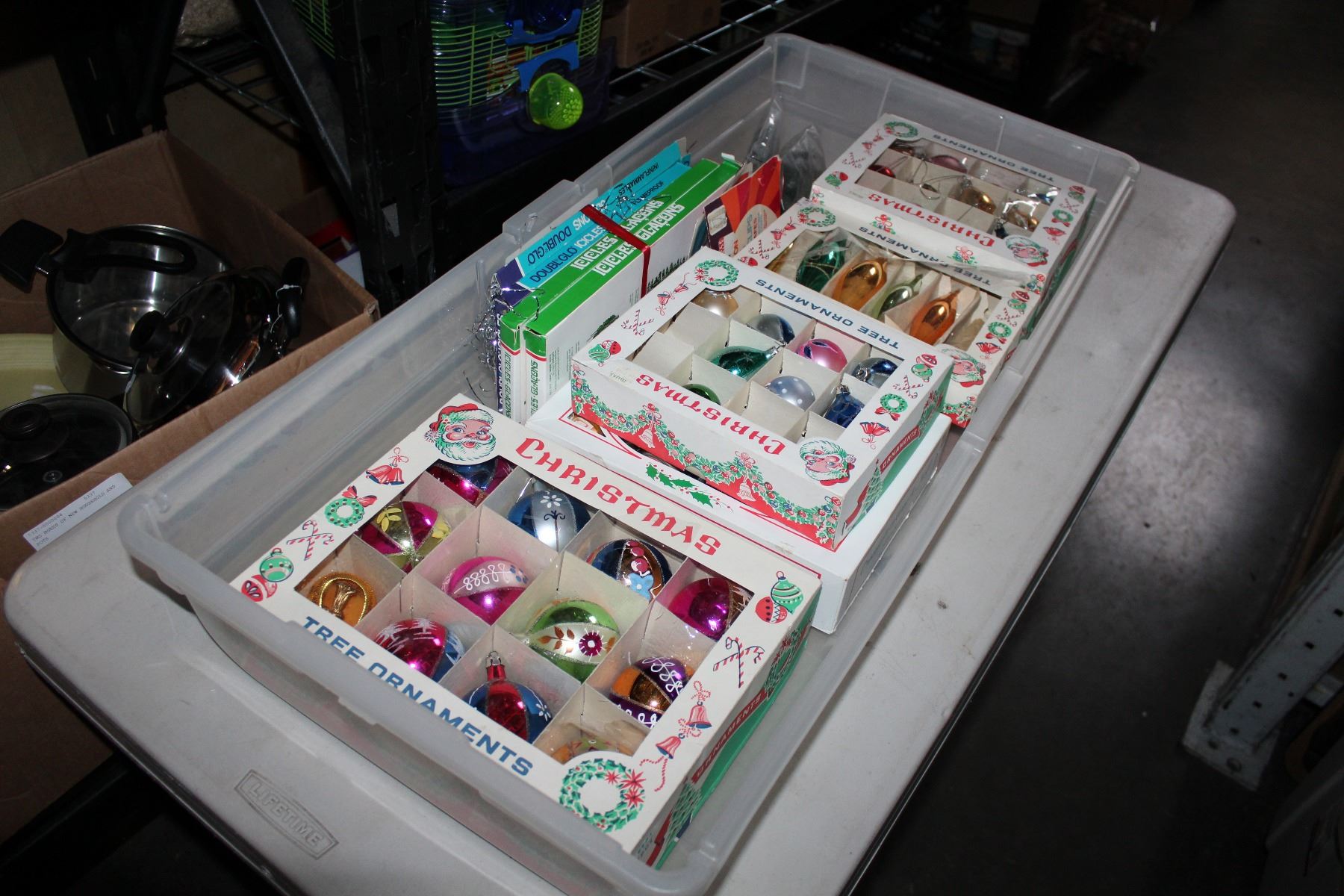 TOTE OF VINTAGE CHRISTMAS ORNAMENTS