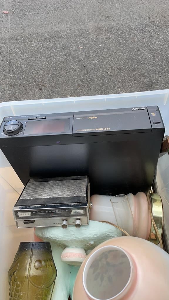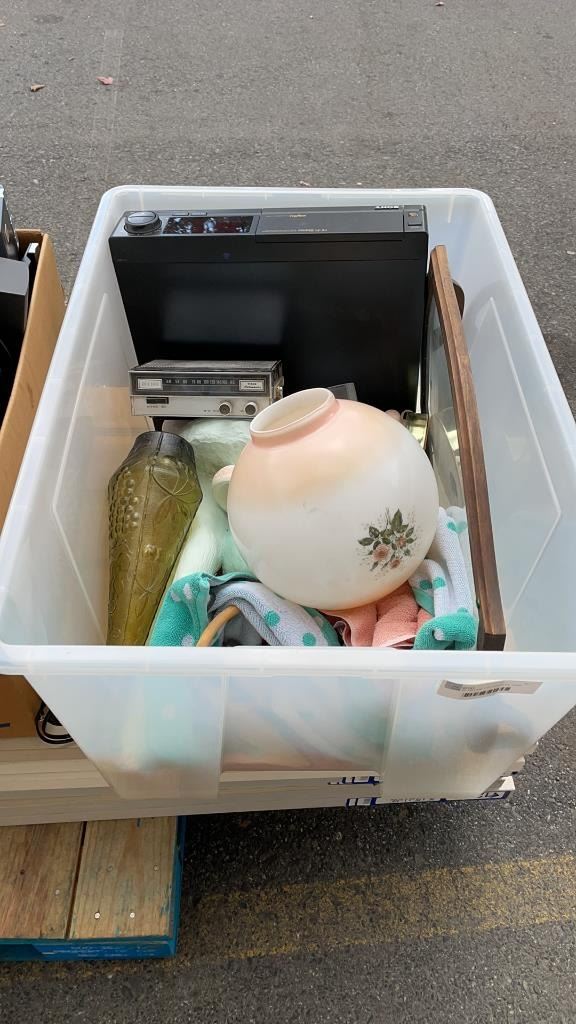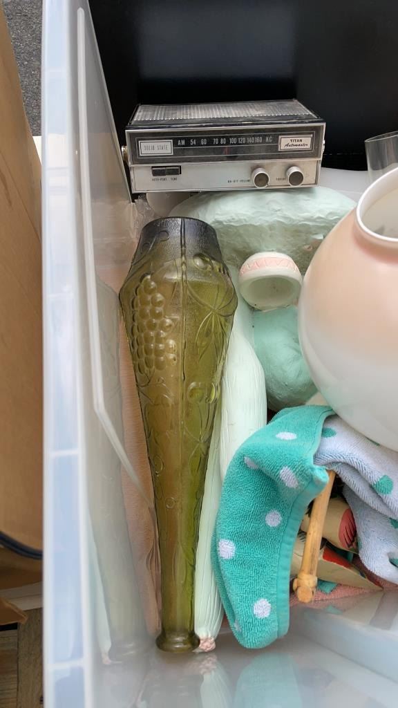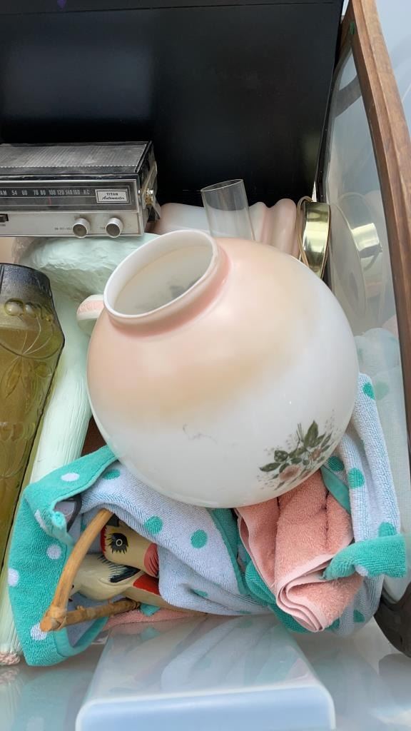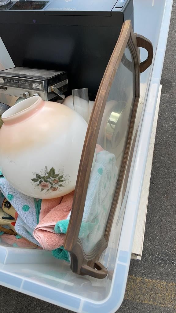 TOTE OF VINTAGE COLLECITBLES, LAMP, GLASS SERVING TRAY