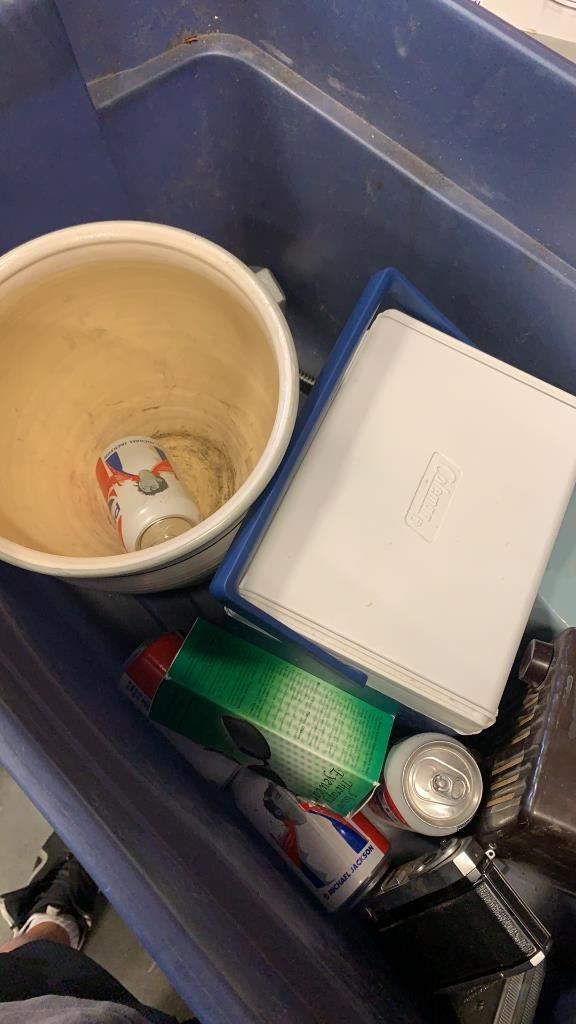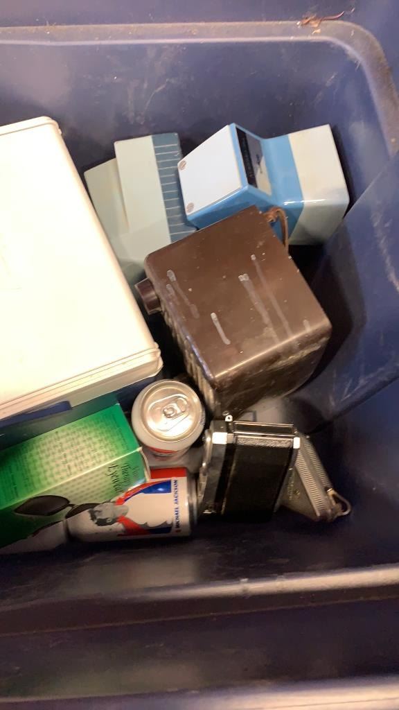 TOTE OF VINTAGE COLLECTIBLES, CAMERA, VIEWFINDERS, RADIO