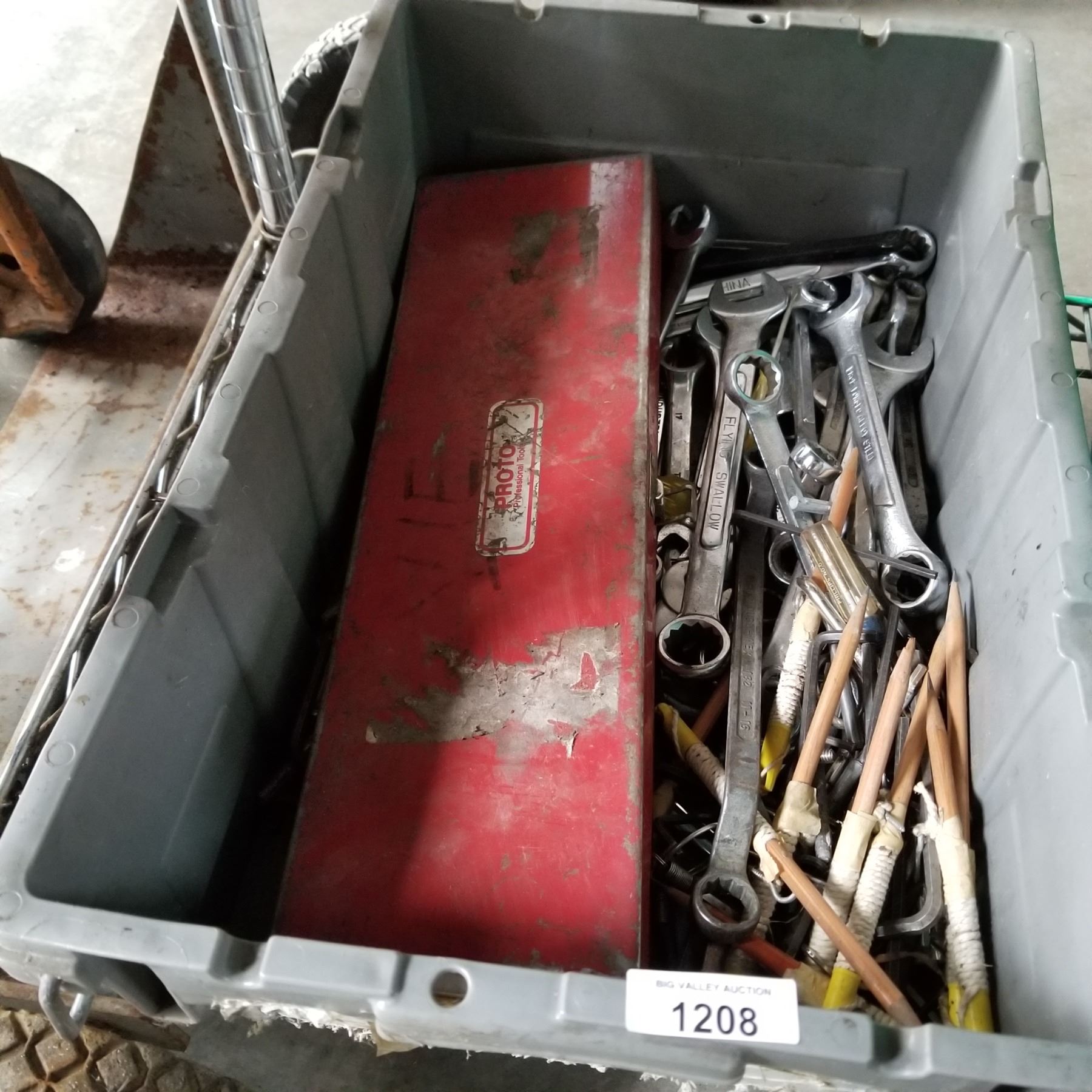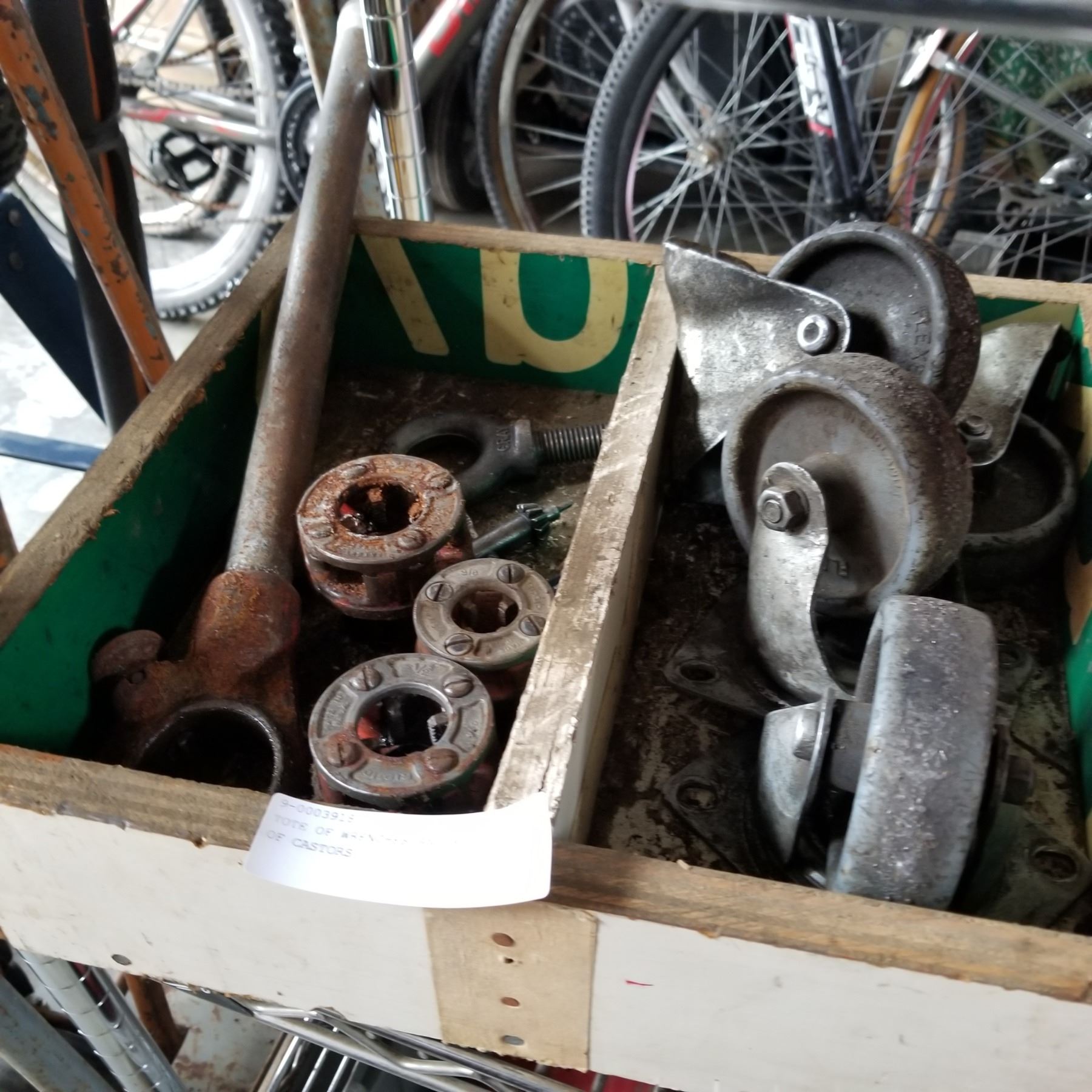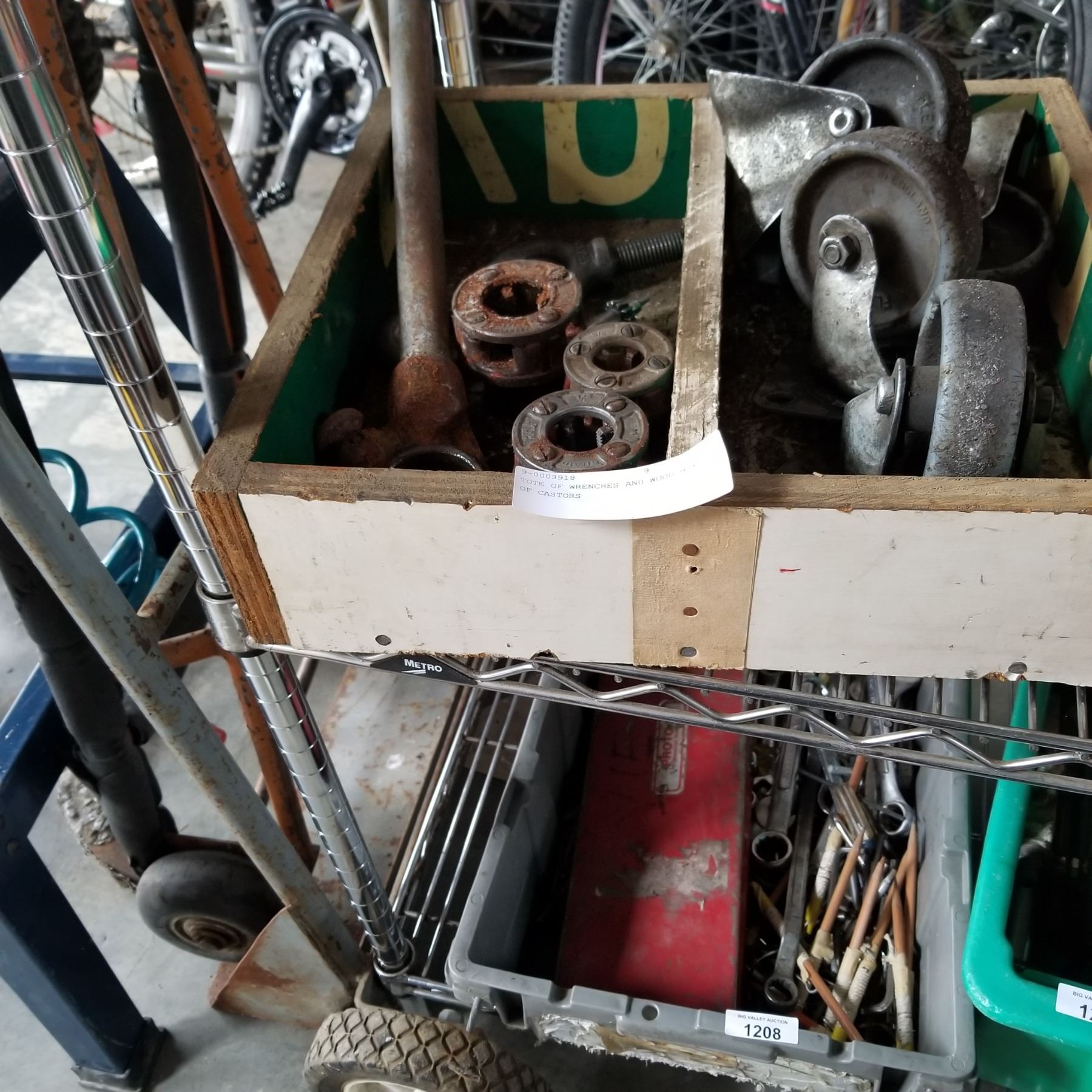 TOTE OF WRENCHES AND WOOD BOX OF CASTORS