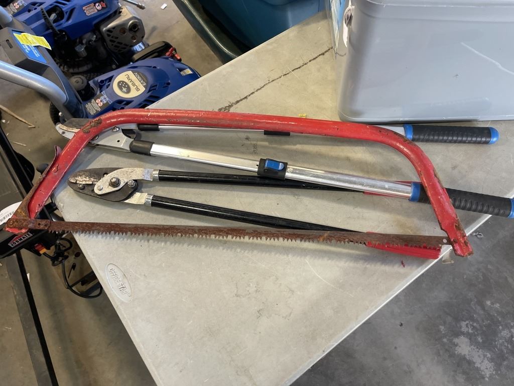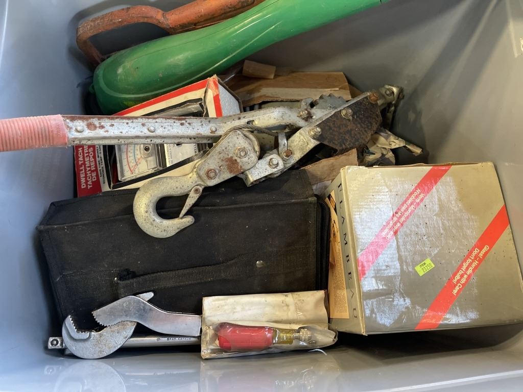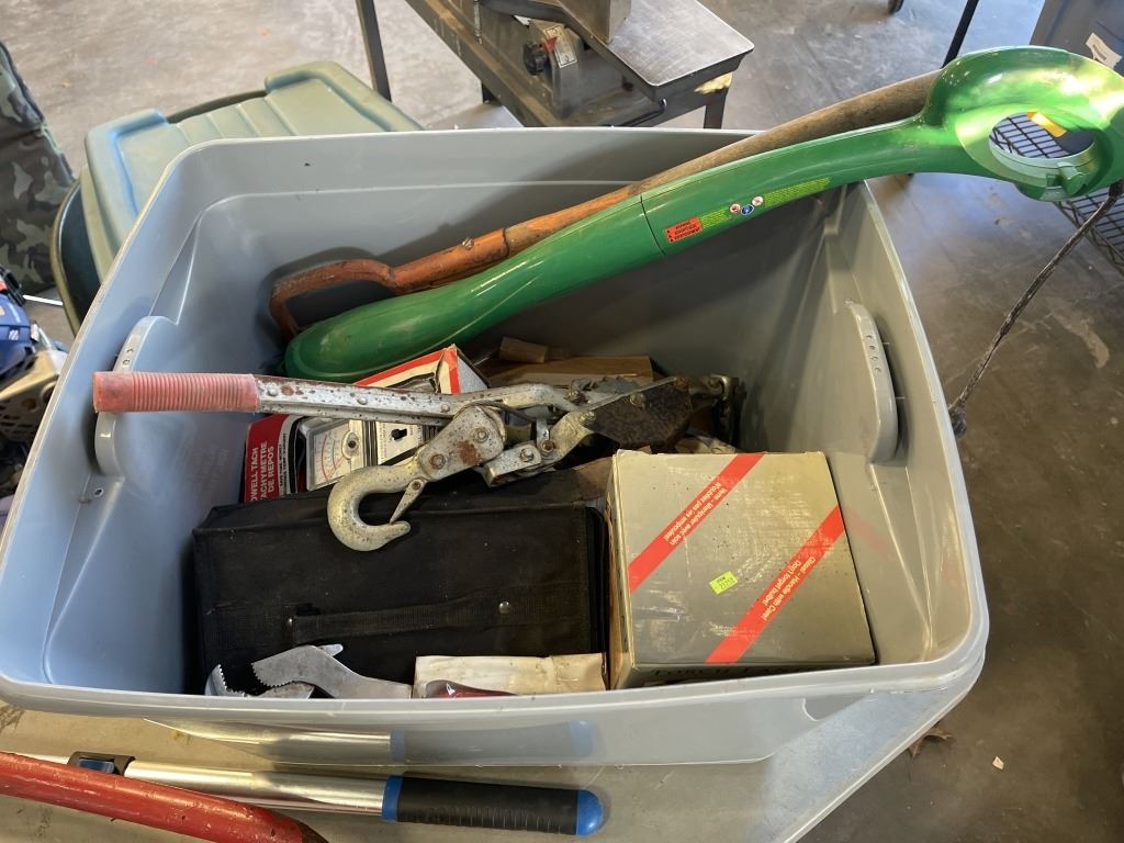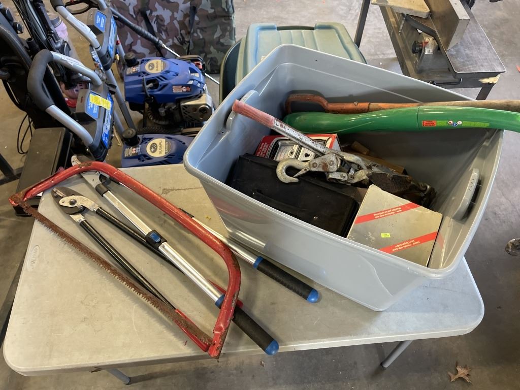 TOTE WITH GARDEN TOOLS, WINCH, SAW AND MORE