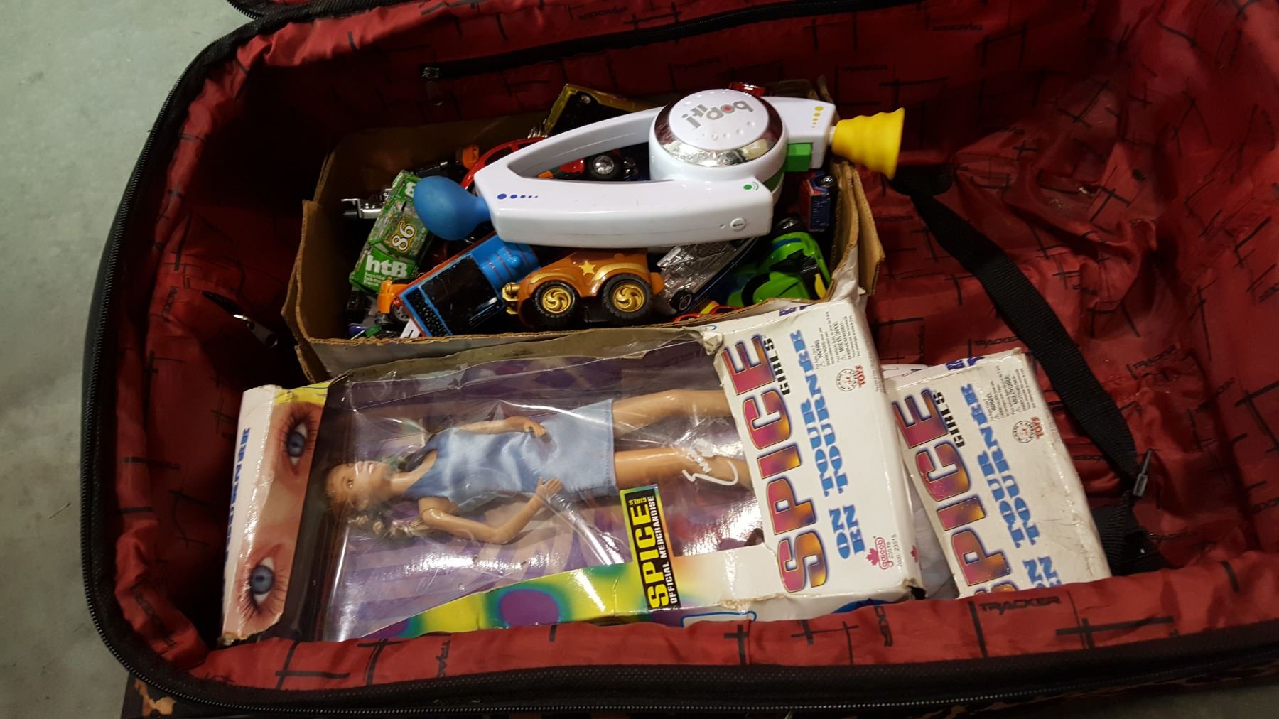 TRACKER SUITCASE WITH SPICE GIRLS AND LOT OF MATCHBOX CARS AND UMBRELLA STAND