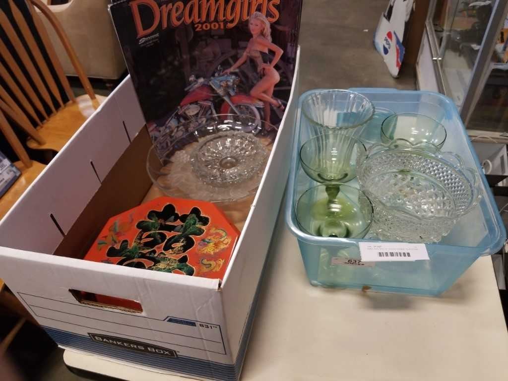 TRAY AND BIN OF GLASS VASES, PLATTERS AND EASTERN LIDDED DISH