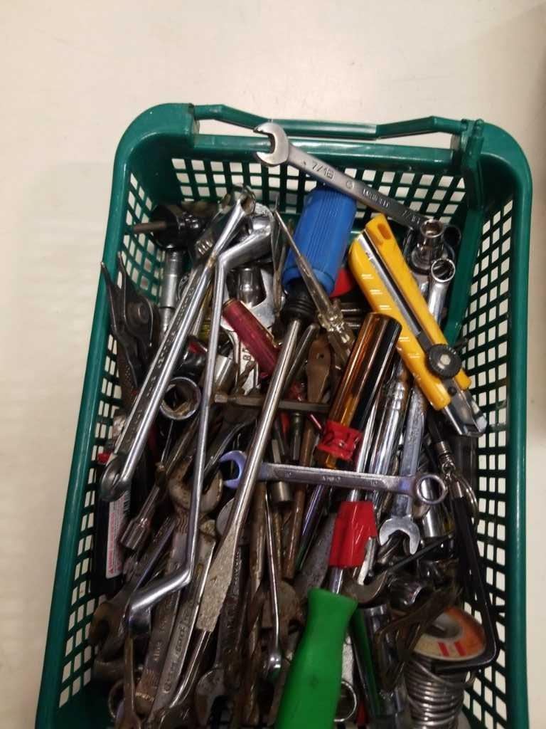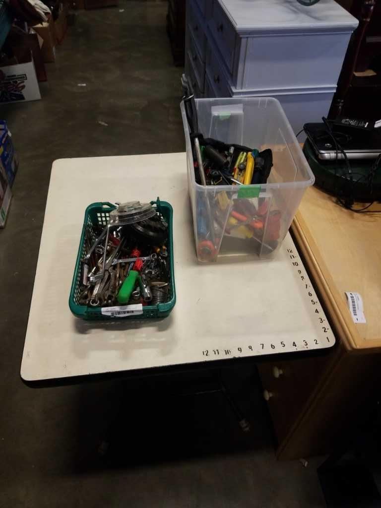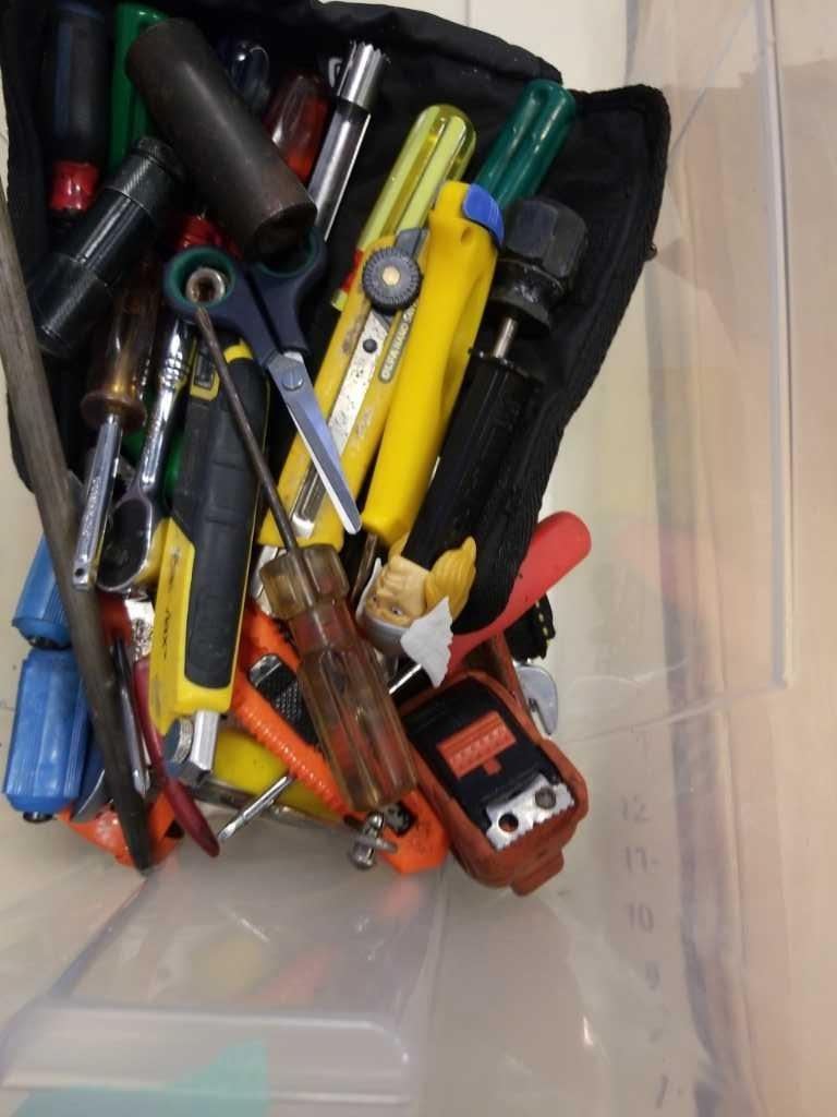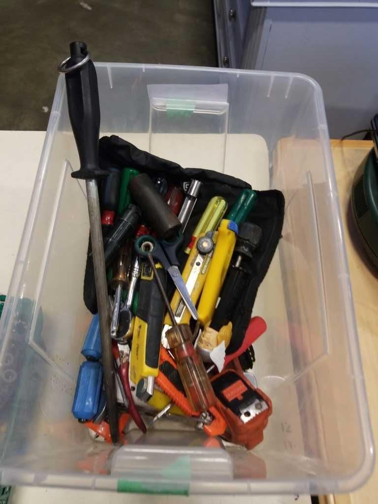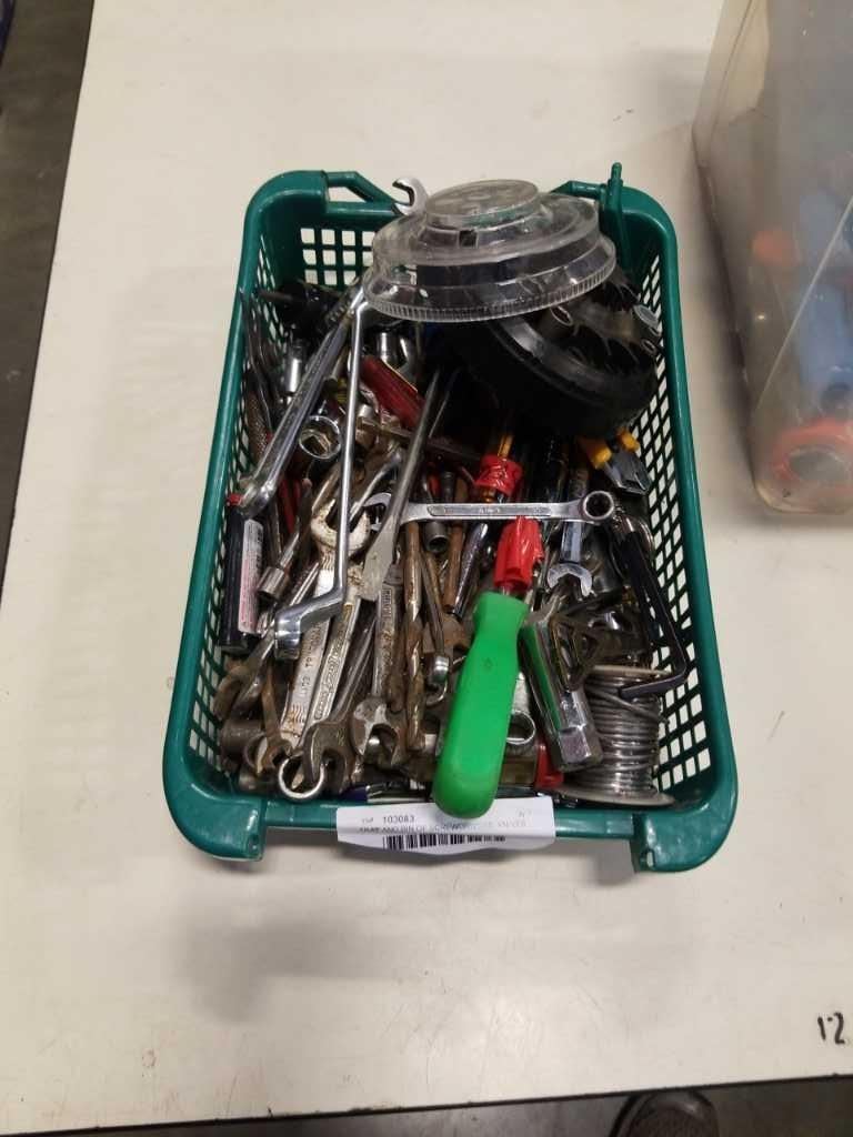 TRAY AND BIN OF SCREWDRIVERS, KNIVES AND TOOLS
