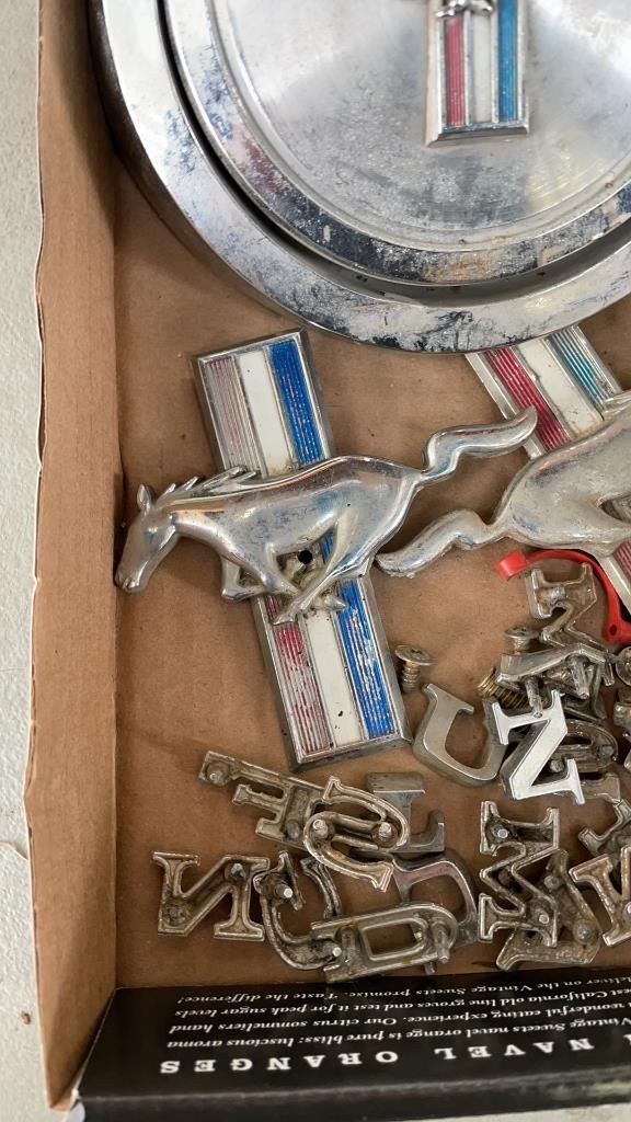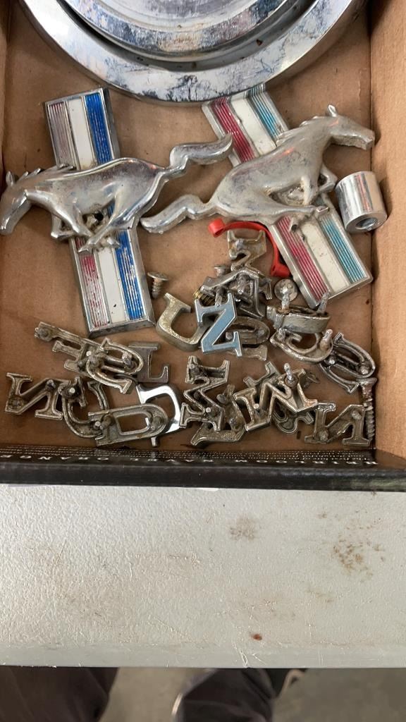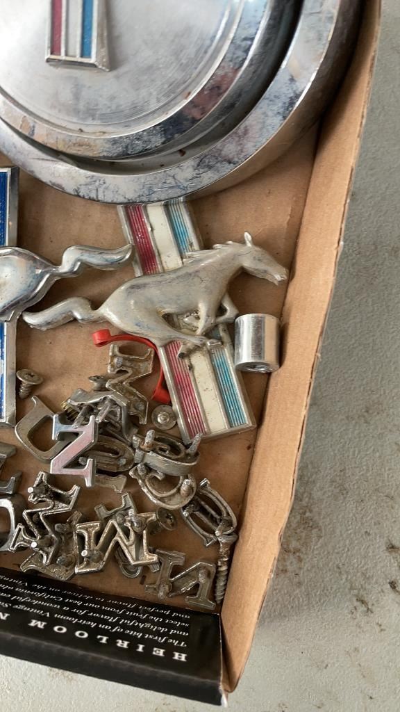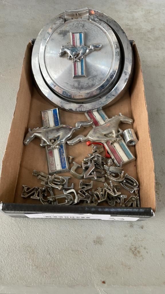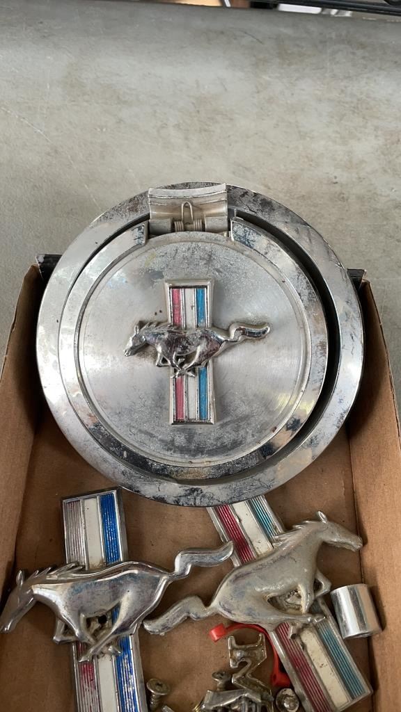 TRAY OF 1968-1972 FORD MUSTANG EMBLEMS AND GAS TANK COVER