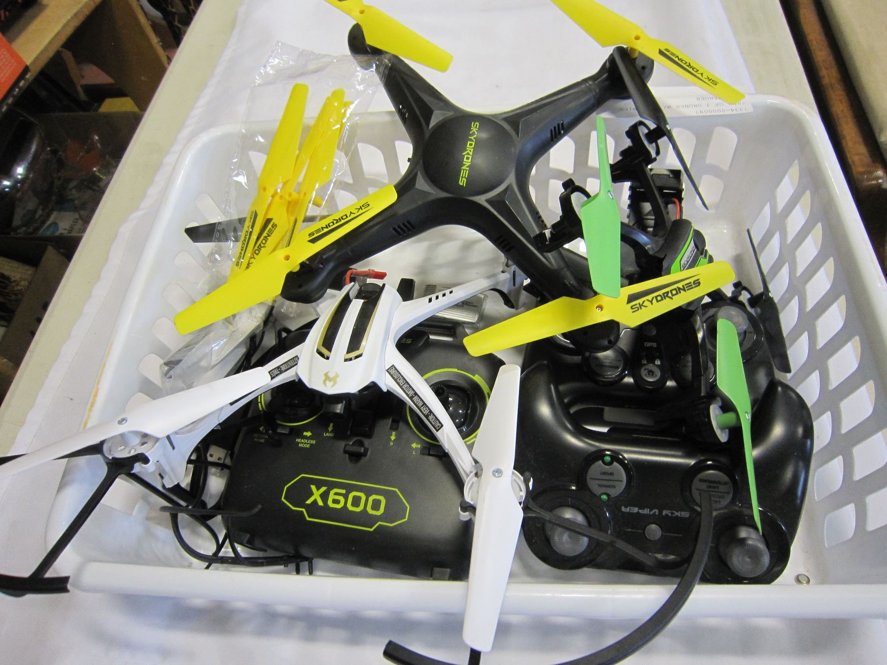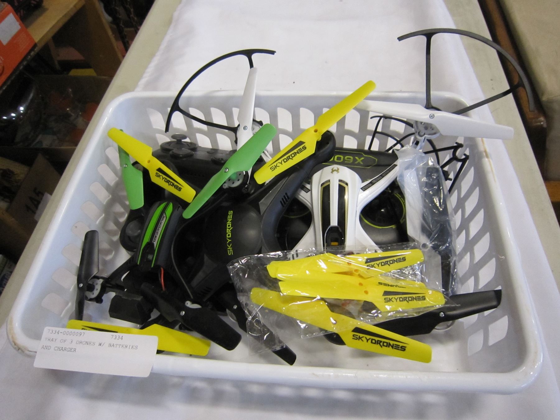 TRAY OF 3 DRONES W/ BATTERIES AND CHARGER