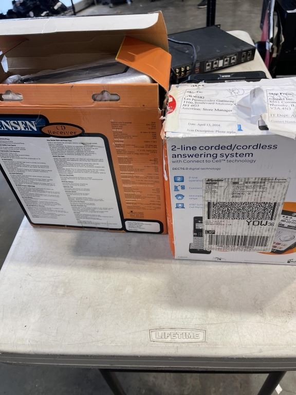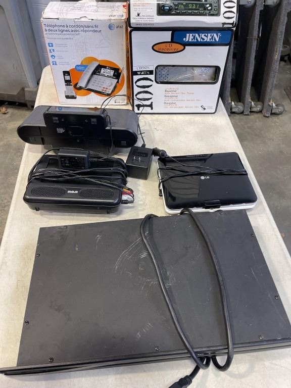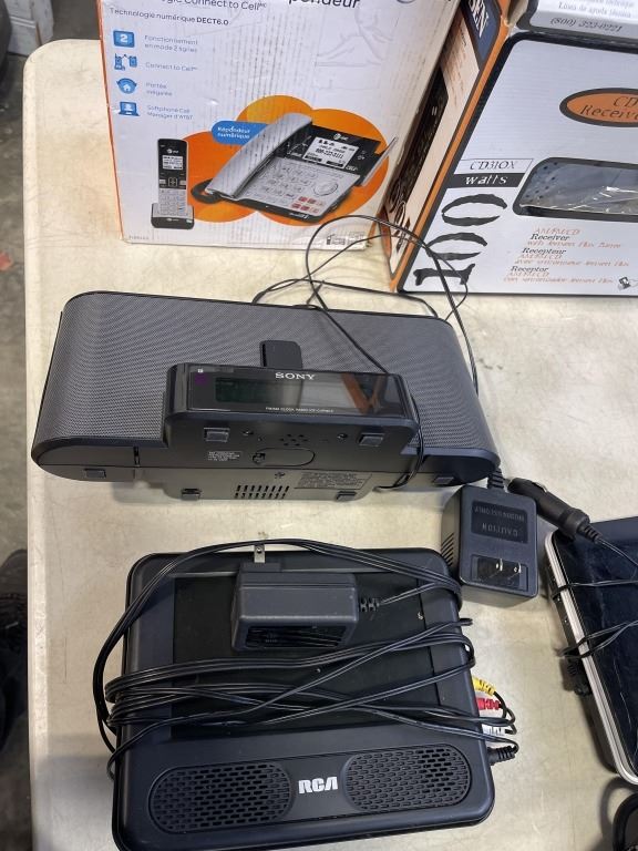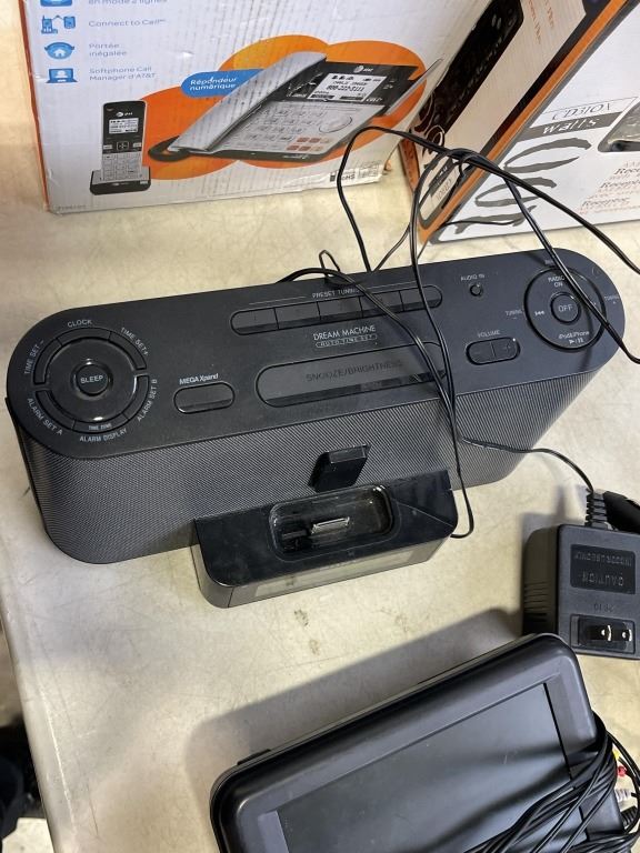 TRAY OF ASSORTED ELECTRONICS - PHONE, CAR STEREO, IPOD DOCK, ETC