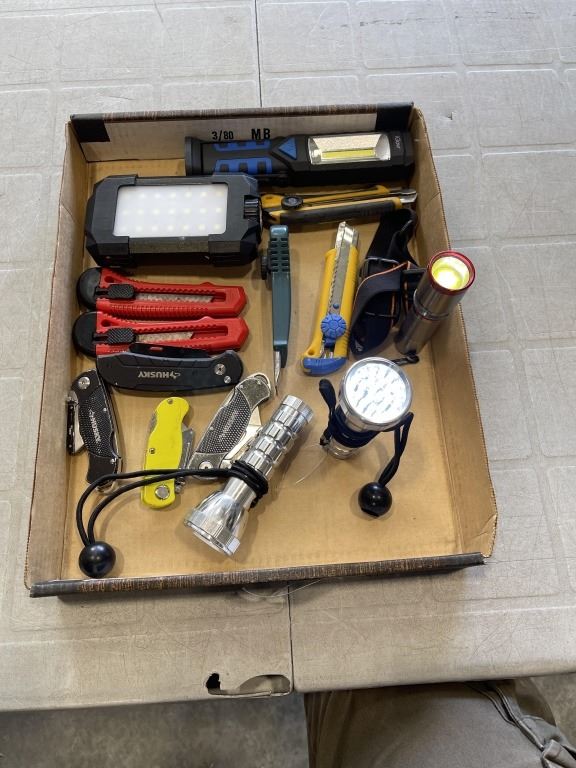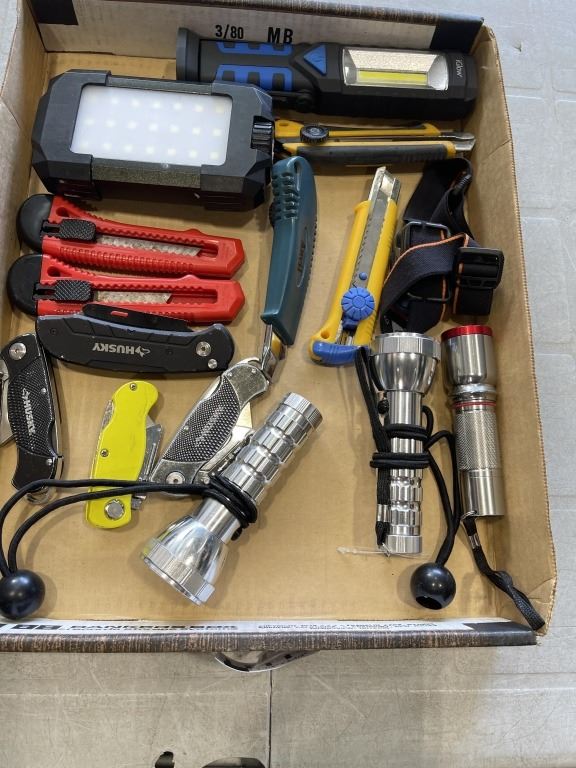 TRAY OF ASSORTED FLASHLIGHTS AND BOX CUTTERS