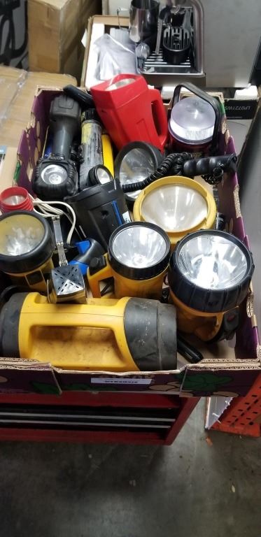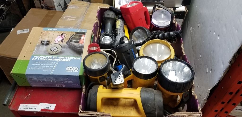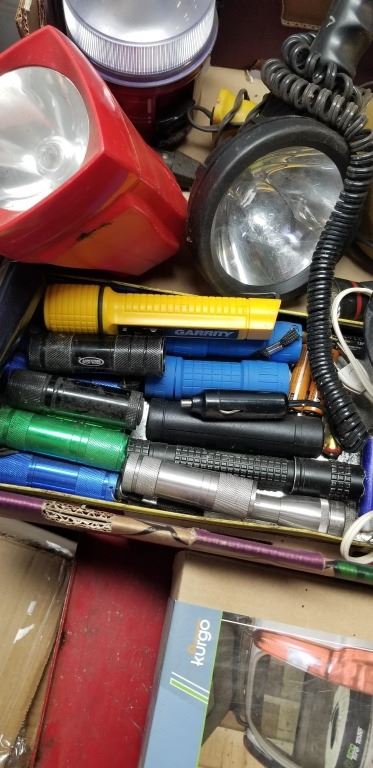 TRAY OF ASSORTED FLASHLIGHTS AND SPARE TIRE COVER