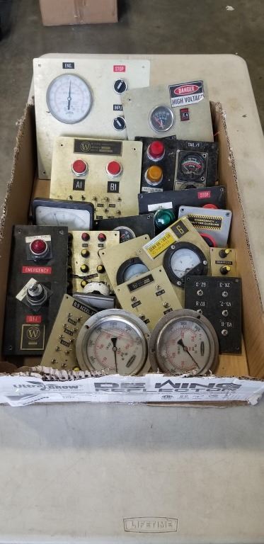 TRAY OF ASSORTED GUAGES, SWITCH PANELS ETC