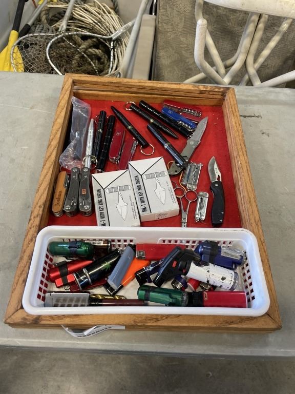 TRAY OF ASSORTED KNIVES, LIGHTERS, DEFENCE KEYCHAINS ETC