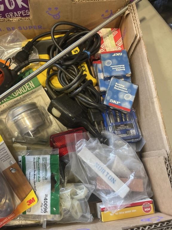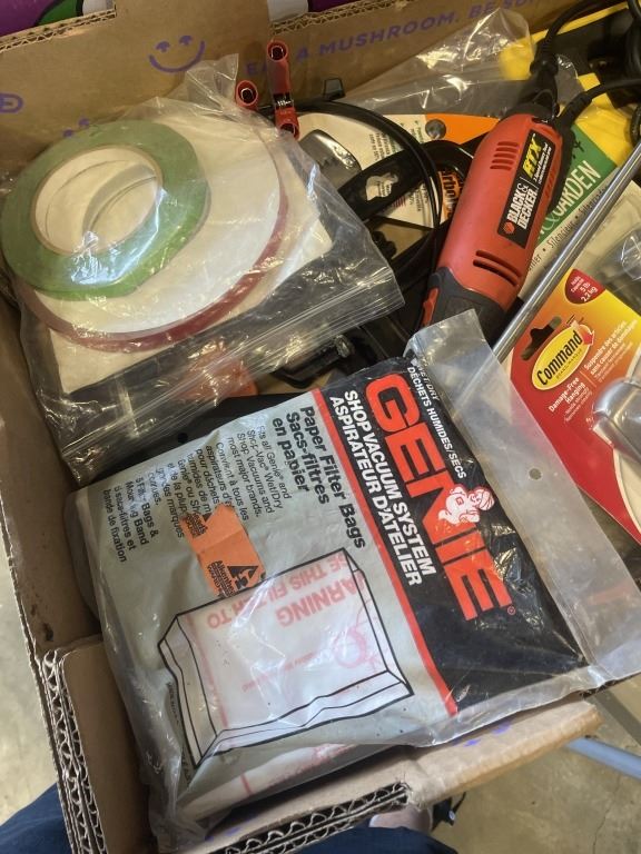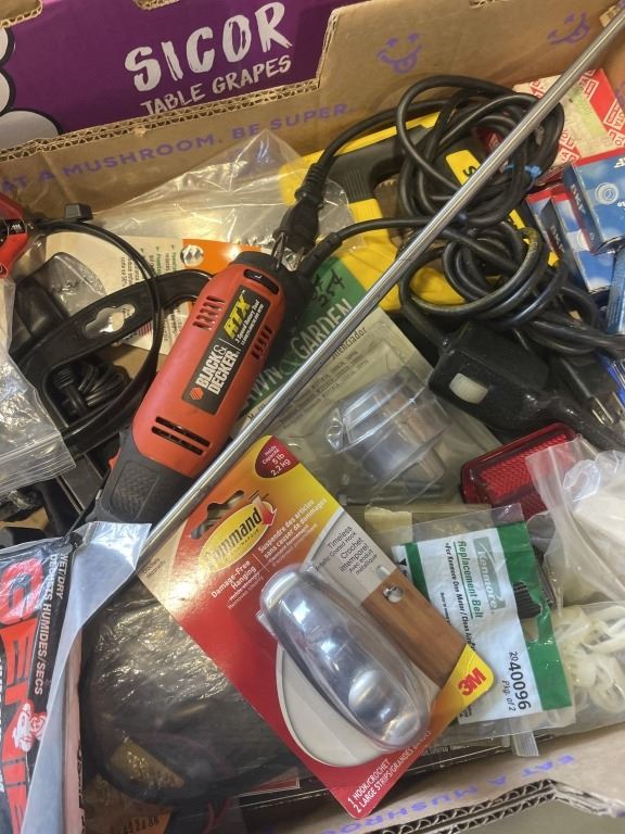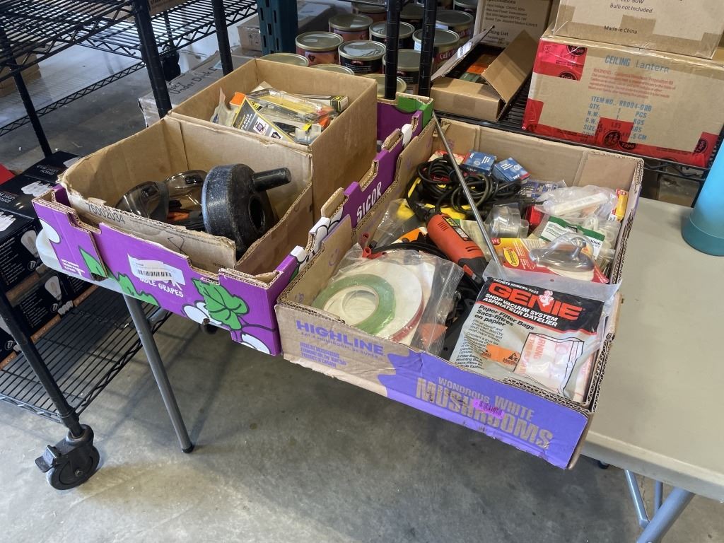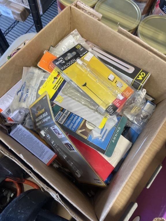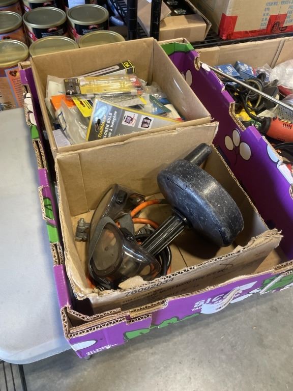 TRAY OF ASSORTED SHOP HARDWARE AND ROTARY TOOL, GLU GUNS ETC AND TRAY OF HALOGEN REPLACEMENT BULBS, DRAIN SNAKE, ETC