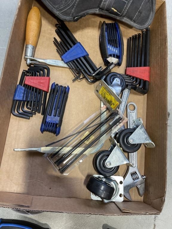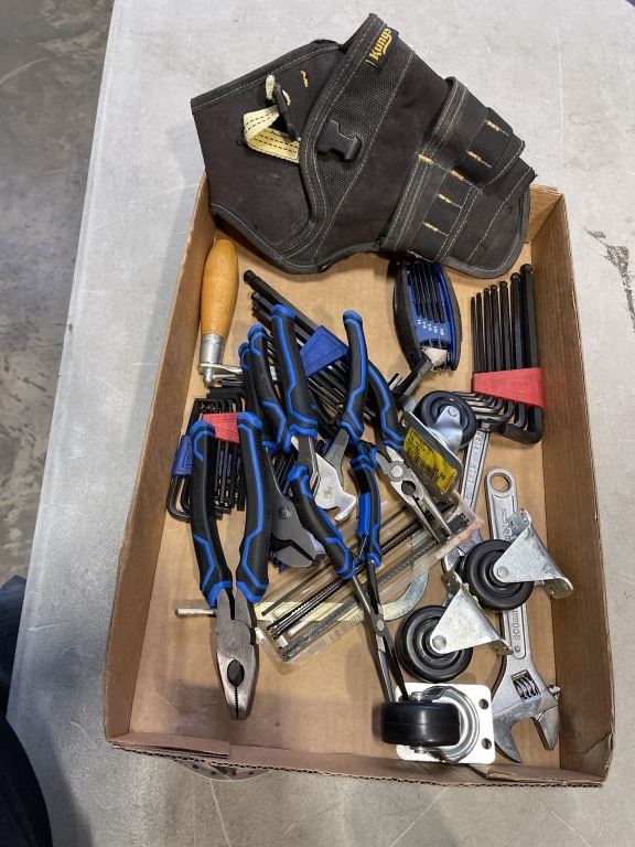 TRAY OF ASSORTED TOOLS - PLIERS, CASTERS, WRENCHES, ETC
