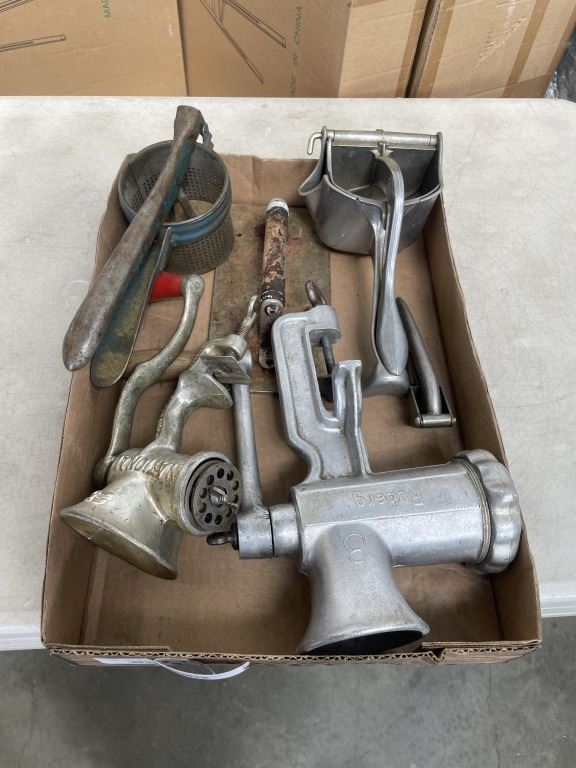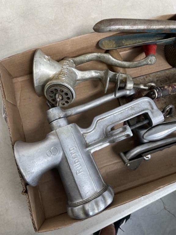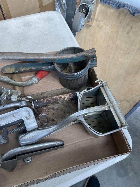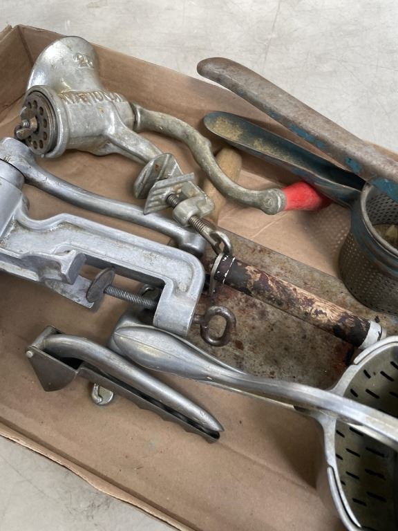 TRAY OF ASSORTED VINTAGE GRINDERS AND PRESSES