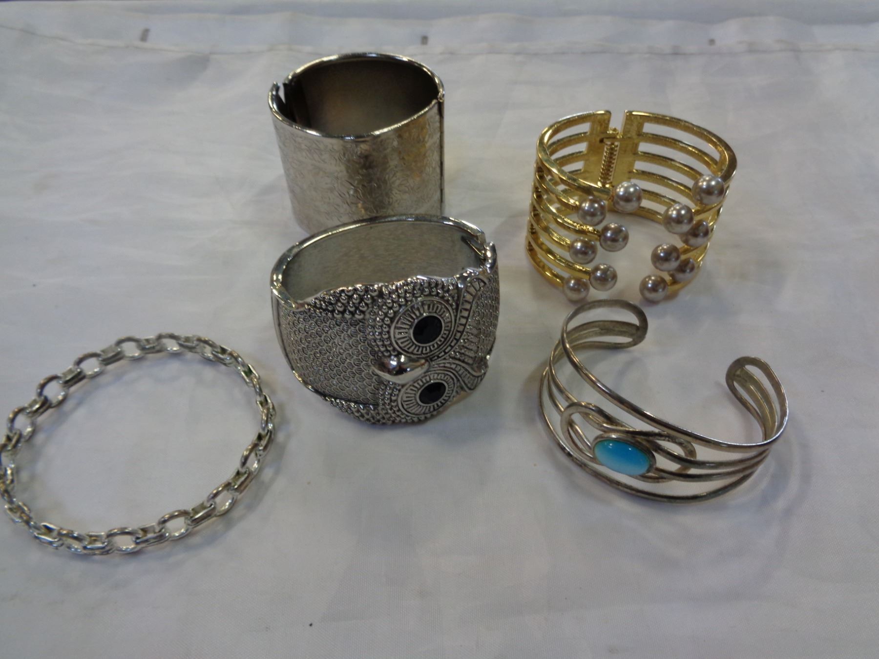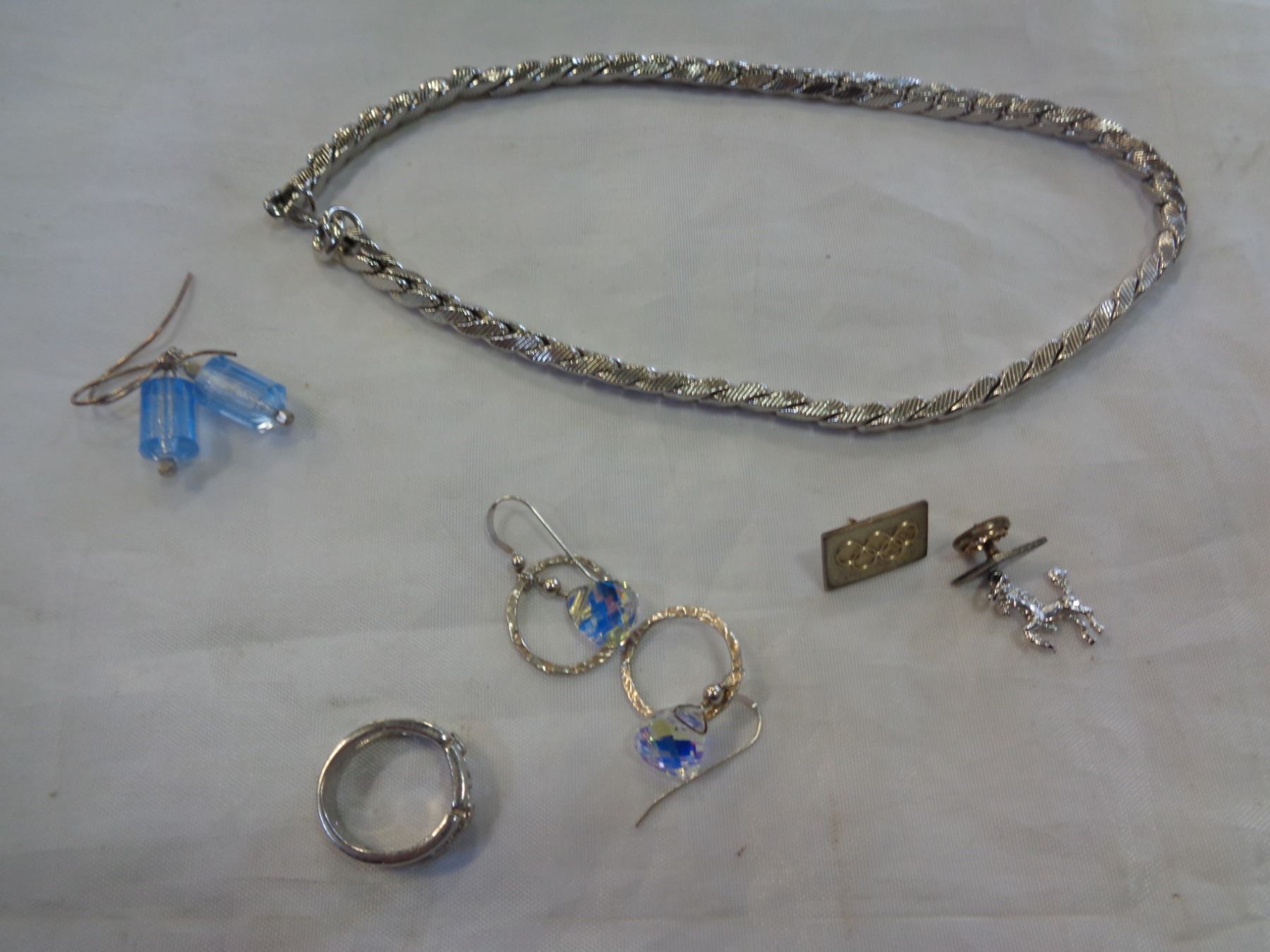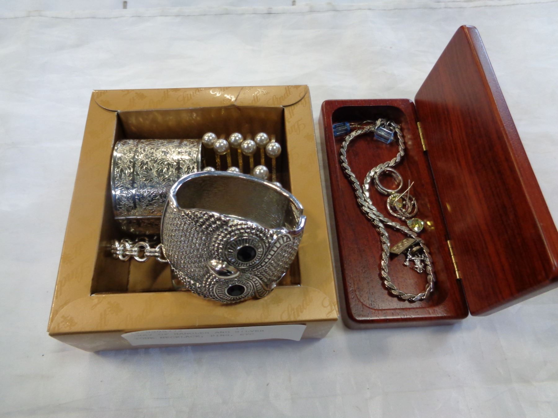 TRAY OF BANGLES AND SILVER TONE NECKLACE, PINS, ETC