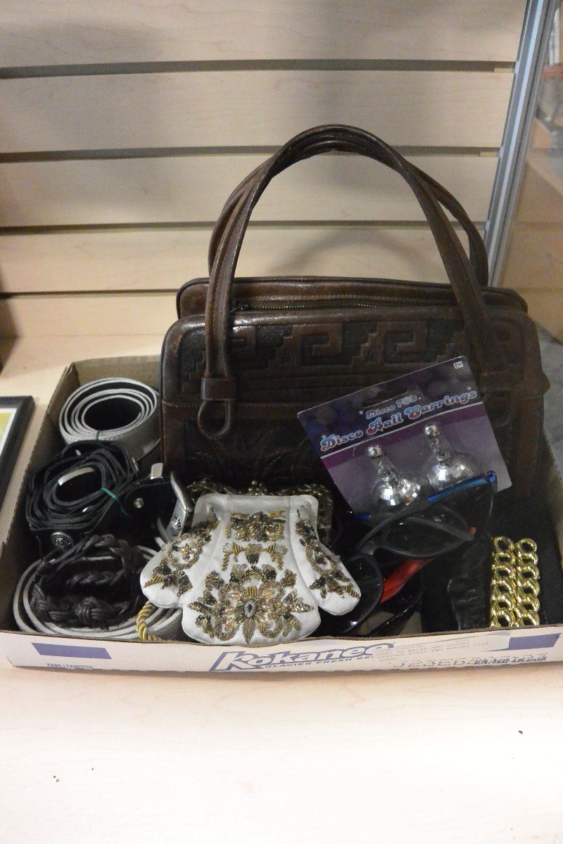 TRAY OF BELTS AND TOOLED LEATHER PURSE AND BEADED SILK