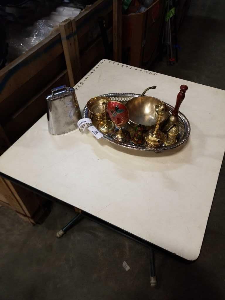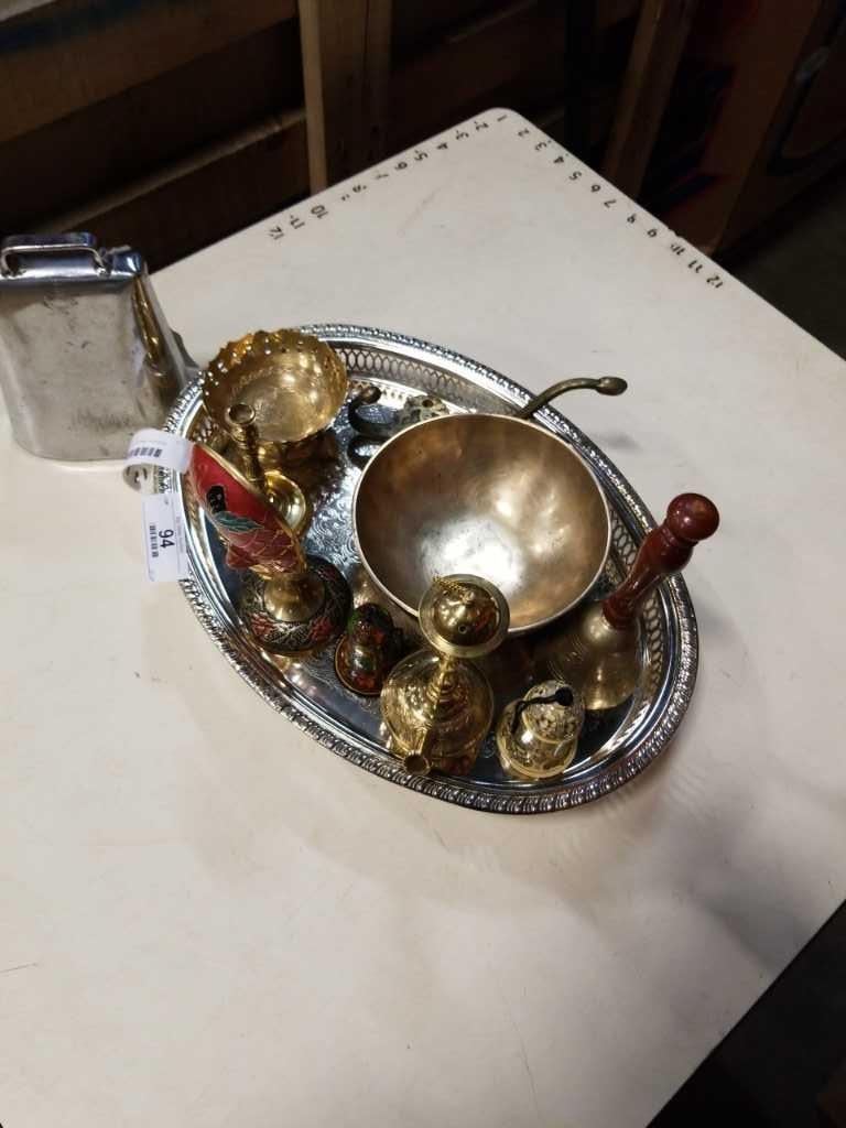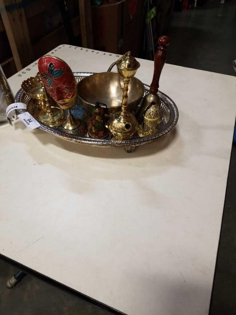 TRAY OF BRASS DECOR AND VINTAGE ZILDJIAN ZIL BELL DRUMMER COW BELL