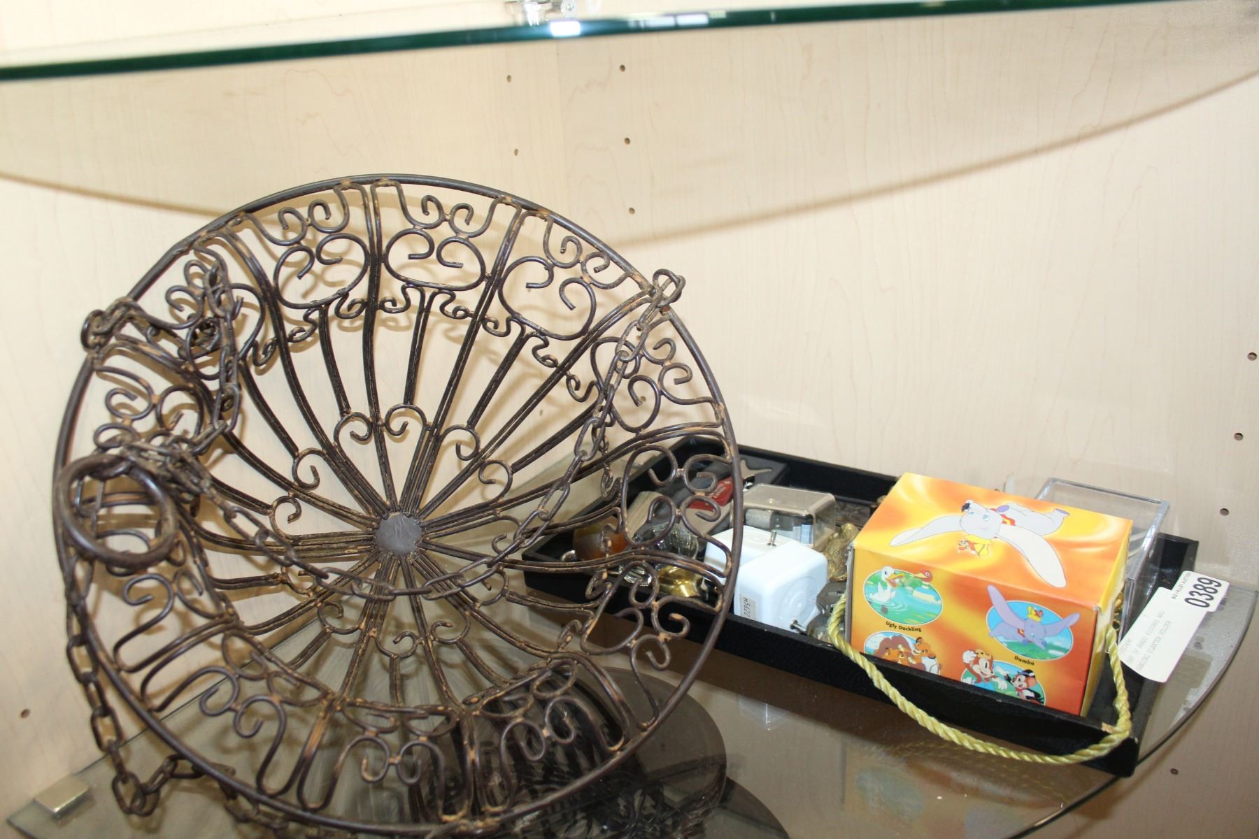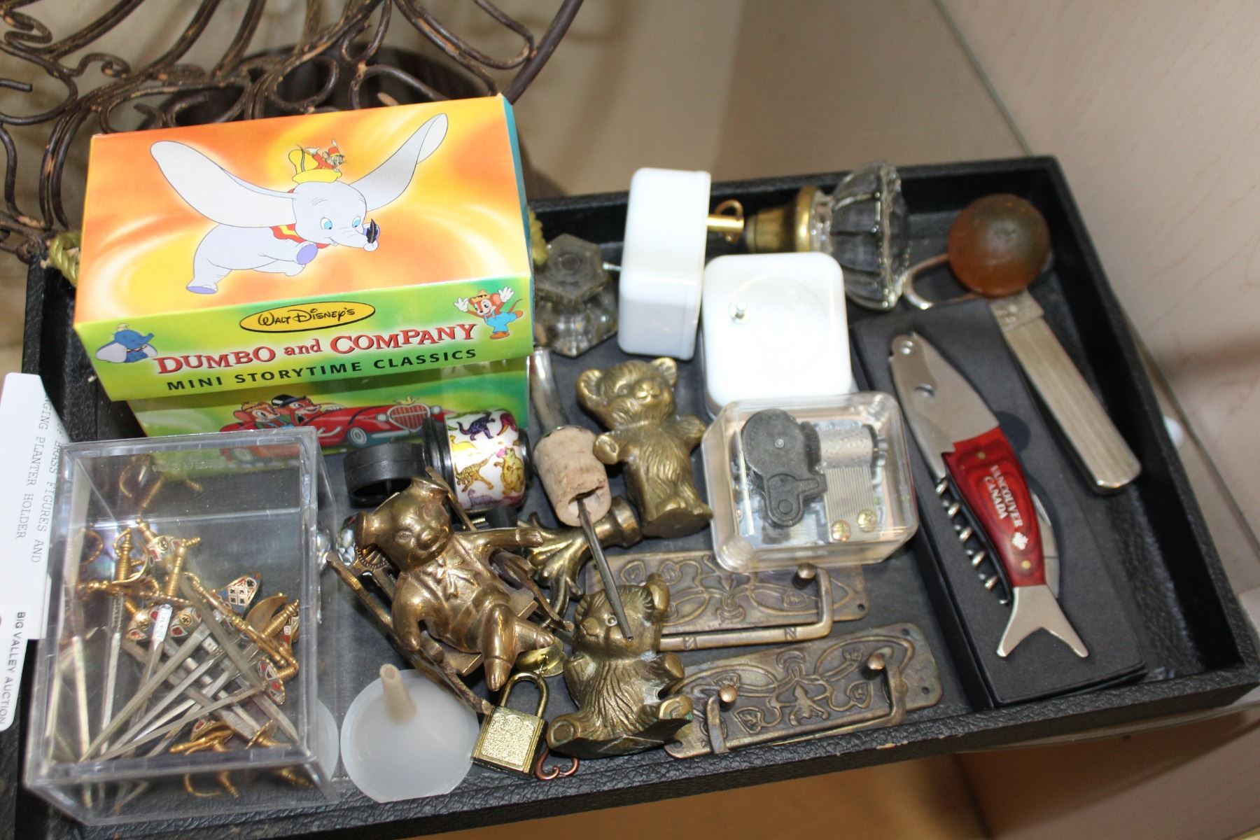 TRAY OF BRASS FIGURES AND HANGING PLANTER HOLDER