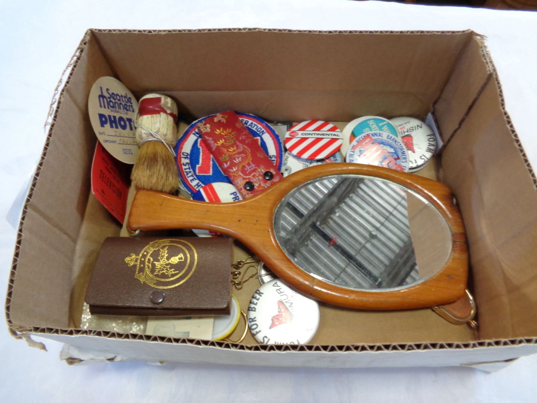 TRAY OF BUTTON PINS, HAND MIRROR, AND COLECTIBLES