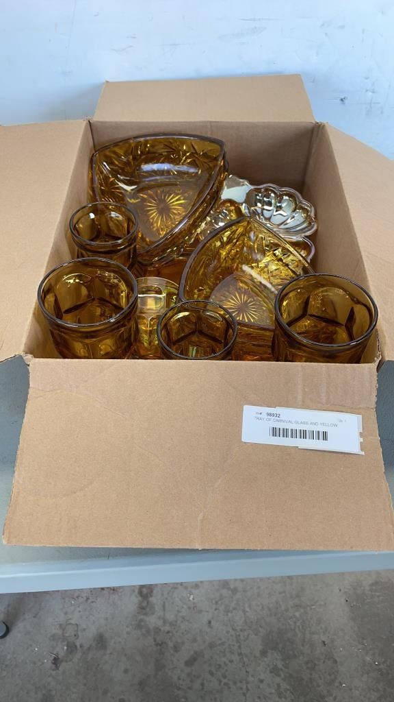TRAY OF CARNIVAL GLASS AND YELLOW GLASS CUPS AND SERVING PIECES