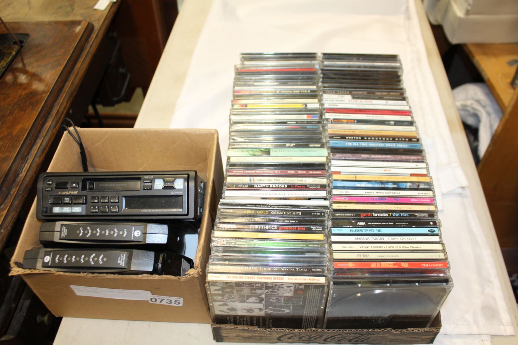 TRAY OF CDS, ALPINE CAR STAREO , AND MODEMS